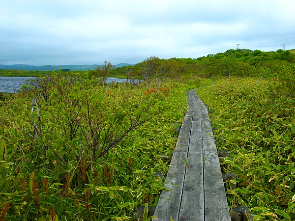 メグマ沼は稚内空港にほど近い所にある円い形の神秘的な海跡湖。昔かメグマ沼周辺は、地元の人たちが“主の住む沼”と呼び、湿原で近づくものもなく保存状態が極めて良く保存されている沼です。沼周辺77.5haの湿原は、中高層湿原に属し、エゾノリュウキンカ、エゾカンゾウ、ミズバショウ、ノハナショウブなど200種を越える植物が確認されていて、5月から8月下旬にかけ可憐な草花が沼周辺を華やかに彩ります。70種以上と多くの野鳥が飛来するこの沼は、湿性植物観賞や、バードウォッチングに最適です。この貴重な自然を保護するためと、「メグマ沼」の湿原全容を観察できるようにする目的で、3.5キロメートルの散策用遊歩道(木道)が設けられていましたが、木道の一部が欠損し北側には行けません。近年白鳥の飛来が確認されたり、いままではサロベツにしか生息されていないとされていた“コモチカナヘビ”が発見されています。