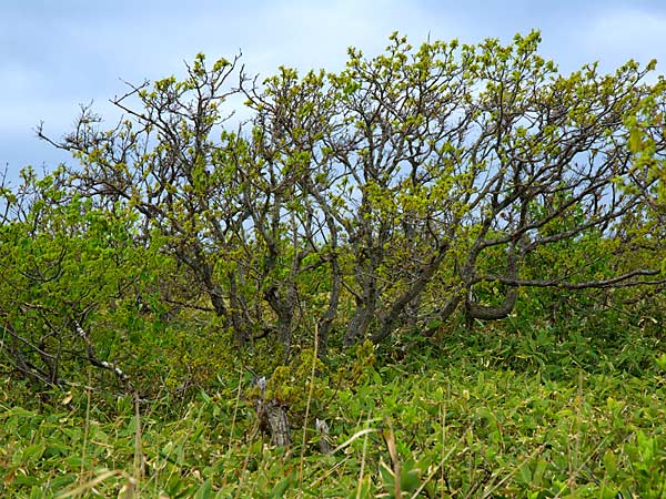 メグマは声問、富磯間約8kmの海岸地帯ですが、このメグマ海岸に沿って国道238号が走り、その国道の山側には防風林が長く続いています。この防風林と国道にはさまれて、一定の高さより延びない植物が延々と続いています。これが昭和43年に稚内市の文化財の指定を受けたブナ科ミズナラの大群落。宗谷海峡から直接吹きつける潮風と北西の強い季節風のため、に山側に傾いて手をつなぎお辞儀をしているような特異な景観です。どこにでもあるミヅナラもこのような大群落をなしている所ははとても珍しく日本海北部海岸の一部と稚内、北見枝幸付近の海岸、根室半島に残っている。このような林を風衝型樹木森と呼んでいる。写真は湿原内に生育している水ナラで極めて珍しい。