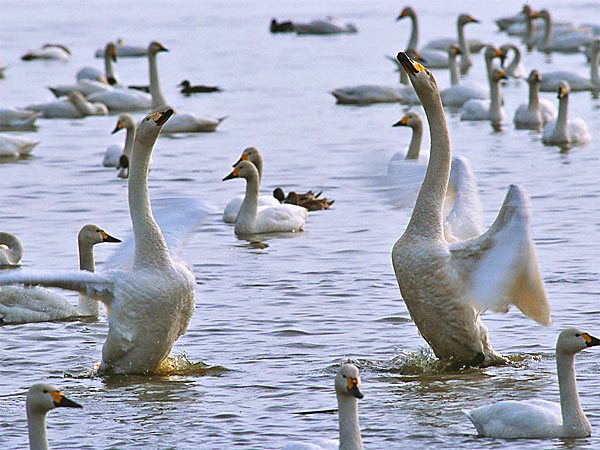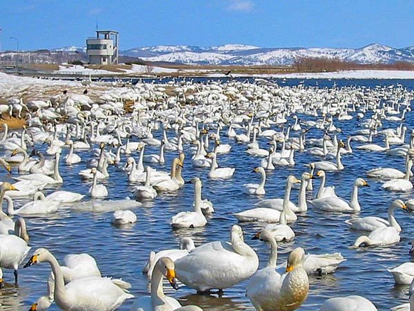 大沼は周囲約10km、最深1.5m程度で、周囲は湿原地帯。春と秋には1日に約5.000羽のコハクチョウが飛来します。ハクチョウのほかマガン、アオサギ、オオワシなど通年100種以上の野鳥が観察できます。またミズバショウをはじめとする湿性植物なども楽しめるが釣りは禁止です。