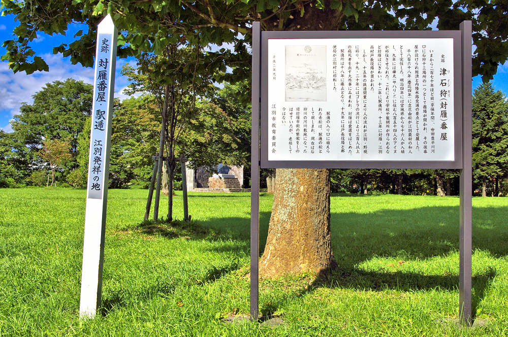 説明ばんより「今から270年ほど前(享保年間)、世田豊平川口に石狩13場所の一つとして商場が開かれ、その後番屋が設けられ鮭漁と内陸水路交通の要点として発展した。慶応4年に立花由松が江別最初の和人として定住した。明治4年には宮城県から76人が入植し、9年には樺太(サハリン)に住む854人のアイヌが移住させられた。これにより学校や製網所が作られるなど対雁は賑わい、12年に駅逓所、13年には対雁・江別両戸長役場が置かれた。しかし、15年の鉄道開業により人の流れが江別・野幌に移り、19・20年にはコレラの流行により300人以上の病死者をだす大惨事にみまわれ、対雁は衰退をはじめた。駅逓所は18年廃止となり、19年には戸長役場と郵便局が江別村にいてんした。駅逓の入口に植えられた赤松は、駅逓の松として親しまれ、現在は石狩川の河川敷地となった旧対雁市街の繁栄をしのばせていたが、老枯して今はない。平成2年9月 江別市教育委員会」◇建立年:平成2年9月 ◇建立者:江別市教育委員会 ◇所在地:江別市工栄町 ◇Gmap:マップコード