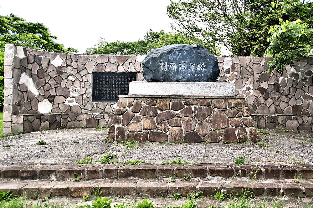 碑文より「由来 本碑ハ弘化三年場所請負人山田文右衛門小祉ヲ建立弁天ヲ祀ル 神体長サ二尺三寸極上ヲナス 翠色天然石文右衛門ノ引網ニカカル事三度ニ及ビ神明ノ致ス所トシテ対雁豊平川口ノ小祉祀ル 是対雁神社ノ前身ナリ 越エテ明治四年四月宮城県涌谷領農民二十一戸七十六人来住対雁村トナル 次ダ同九年七月南樺太アイヌ百二十七戸八百五十四人移住 係開拓使八等出仕上野正ノ発意ニヨリ小祉ヲ修復鳥居ヲ新営シテ対雁神社トナス 一方角山ノ移住者相計諮リ 同年三十七年角山神社を創立天照大神ヲ祀リ来タリシガ 昭和四十六年九月倶ニ国営治水工事ノ為ニ社ヲ解体 神体ヲ本碑内ニ奉置シ以テ永遠ニ之ヲ伝エントス 昭和四十六年九月十日 碑書 江別市長 山田利雄 撰文 新館長次」※碑文には「次ダ同九年七月南樺太アイヌ百二十七戸八百五十四人移住」とあるが、彼らが上陸した宗谷から銃剣で強制的に連行したもので移住いえないものだった。そこまでして連行した理由は空知の炭坑に彼らを送り込む計画があったからと云われている。対雁ではコレラや天然痘の流行があり移住者の半分近くが亡くなるという大惨事にみまわれた。碑は榎本公園の奥まった場所にあります。◇建立年:昭和46年9月10日 ◇設置者:江別市 ◇所在地:江別市工栄町 ◇Gmap:マップコード