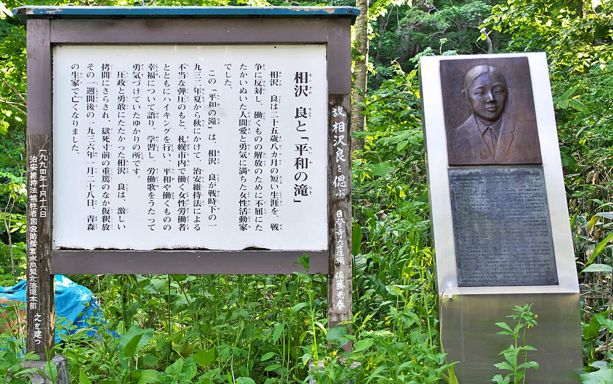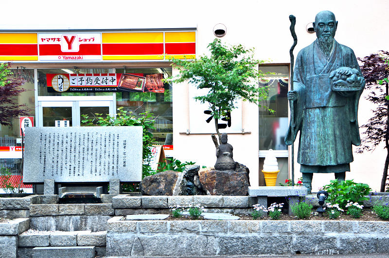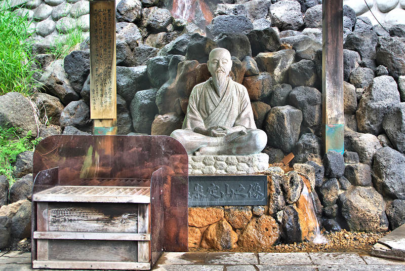 説明板より「美泉定山は文化2()年、備前国(岡山県)で生誕、17歳の頃より全国の霊山霊地を行脚の後、蝦夷地(北海道)へ渡り慶応2年アイヌ民族の案内でこの温泉に辿り着き、病に悩む人々を祈祷と湯時で救おうと努力しました。定山の心情は今に尚この温泉に脈打っています。ぜひ霊験改かな定山渓の湯の効用を直に肌で感じてみて下さい。定山渓温泉」※定山渓温泉を見出しその開発に捧げた定山の生誕200年を記念して平成17(2005)年に竣工した定山源泉公園は、定山が温泉と出会った頃の森を再現したといい、東屋の下で座禅姿の美山が温泉滝に打たれている石像が置かれている。◇建立年:不詳 ◇建立者:不詳 ◇所在地:札幌市南区定山渓温泉東3丁目 ◇Gmap:マップコード