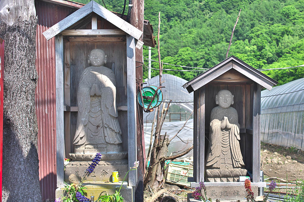 札幌市街より国道230号を定山渓方向に向かい、途中の簾舞から右手に下って豊平川を渡った砥山地区の砥山神社を過ぎて奥の丁字路を右に曲がる「八剣山パークゴルフ場」の案内板が見え、その交差点付近の農地内に地蔵堂が並んでいる。左側の大きい地蔵尊が「延命地蔵」で元々は砥山発電所よりの放水路側近くにあったらしいが、小金湯に抜ける国道のバイパスとして整備された際に現在地に移動したという。右側のやや小さい地蔵尊は「宝性地蔵」で、それぞれの台座正面に名前が刻んである。この地蔵尊は旧簾舞発電所水路で水難した8人の慰霊のためこの土地の所有者が昭和39(1964)年に建立したものです。◇所在地:札幌市南区砥山 ◇Gmap:マップコード