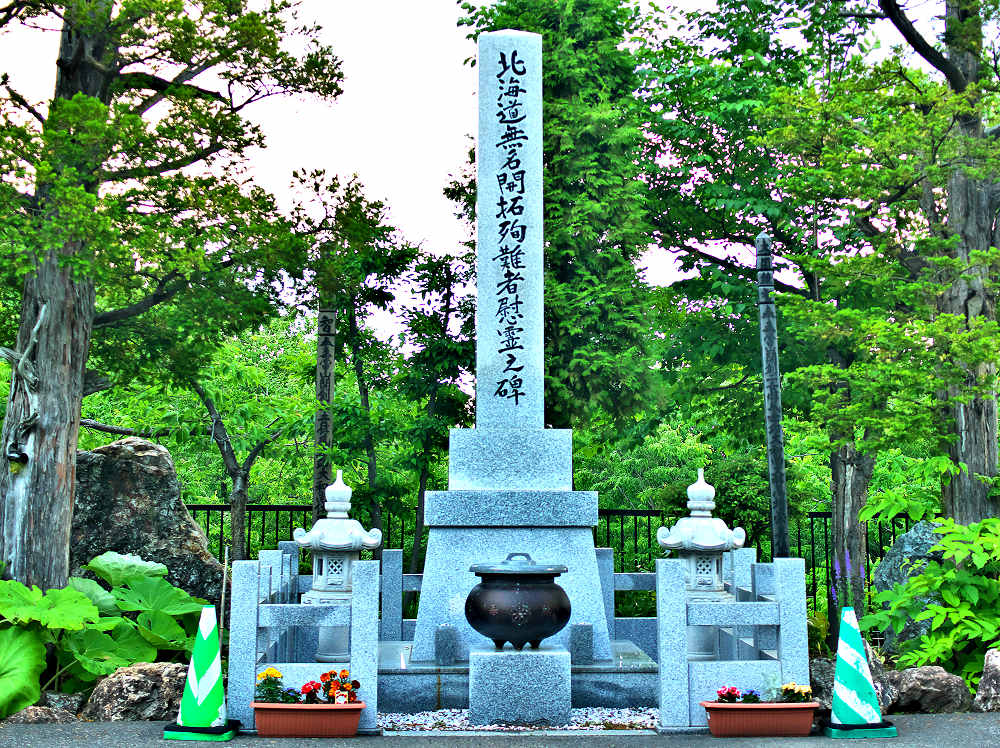 明治23年に対雁移民共催組合の関係者によって本願寺札幌別院対江布教所(現在の眞願寺)に建立されたが、眞願寺の移転で碑も移設、碑は更に現在地へと移設されたようです。対雁に強制移住させられた方々が住んでいたのは現・北海道電力の敷地内というが、明治19(1886)年から明治20(1887)年にかけ大流行した天然痘やコレラで多くの人が亡くなった。江別市真願寺の過去帳では明治19年に267人、明治20年に91人の物故者が記録され、これらが流行病の犠牲者と考えられているが、この当時は石狩町の来札に移住している人も多いので、対雁と八幡来札と合わせて明治19年と20年の死亡者合計は358名か?、明治12(1879)年のコレラ流行による死亡者30人を含めると388人となり、移住者の半分近くが亡くなる悲惨な出来事でした。亡くなられた方は石狩の八幡共同墓地や対雁の墓地に埋葬されたが、対雁埋葬地は霊園内の他に隣接する北海道電力用地に食い込んでいた。昭和36(1961)年から昭和37(1962)年にかけ北電江別新火力発電所工事で坊主山(現・北電変電所)を崩した時に大量の人骨が出土したがブルドーザーでそのまま埋め立てたという。昭和39(1964)年8月の道央地方を襲った大雨で「樺太旧土人先祖之碑」付近の表土が流され多量の人骨が出現したため、江別市は本格的に遺体を掘り起し供養する事にし、道教育委員会を通して関係者の同意を得、昭和40(1965)年8月21日から4日間、北海道大学医学部が発掘調査を行い、土葬遺体6体と副葬品がほぼ完全な形の遺骨(内、樺太アイヌ特有の副葬品を身につけた男1、女2の完全骨格体)と火葬された100体余の遺骨が出土、発掘された約40体の遺骨は北大医学部資料室に運ばれ、残りを墓に再埋葬し供養されたという。墓地では新しい墓碑建設をするとき骨片が玉や刀剣などの副葬品と共に出土する事が度々あり、墓守が樺太アイヌの骨であるという証言もあったようです。また市営墓地に隣接してある北海道電力の敷地にはまだ遺骨が埋ったままという話もある。国家による民族差別と偏見は死者も例外ではなかったと云う事になります。参考文献:樺太アイヌ史研究会編「対雁の碑」◇建立年:明治23年 ◇建立者:対雁移民共催組合関係者 ◊所在地:江別市対雁115-80 市営墓地やすらぎ苑 ◇Gmap:マップコード