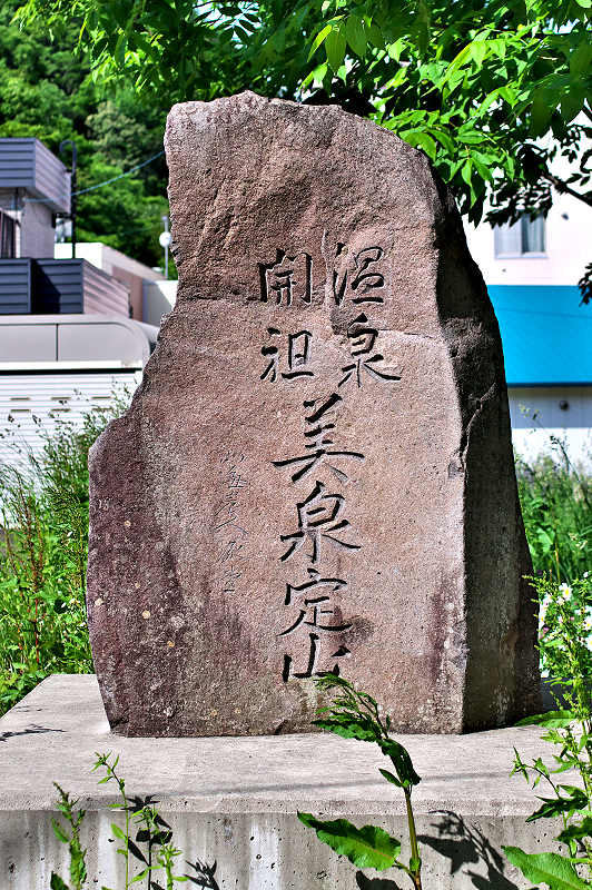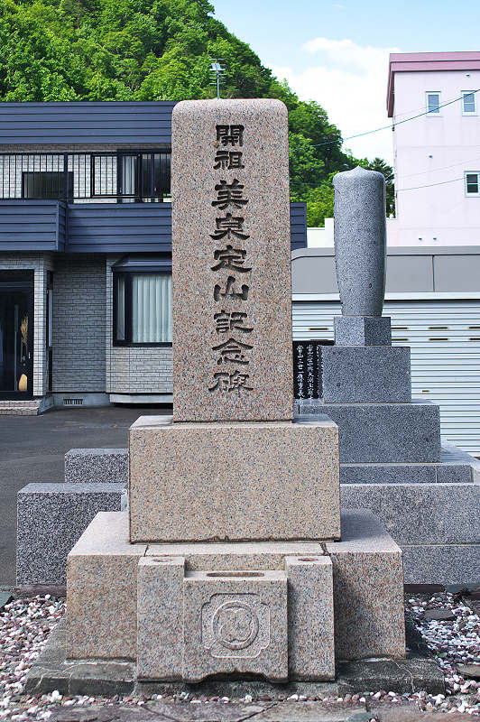定山渓温泉で国道から小道を少し入った所に定山寺があり、境内の一角に「温泉開祖 美泉定山」碑がある。再建されたと思われるコンクリート製台座に置かれた自然石でできた碑面に「温泉開祖 美泉定山」と刻まれ、その左側に「〇海農人〇〇」と小さく刻み左側面に「定山ハ作州ノ人夙ニ北渡シ安政以後蝦夷地ヲ徘徊シ遂ニ此地ニ入リ無人ノ境ニ浴場ヲ開ク明治九年十二月三十日歿ス」と刻まれている。建立年や建立者は確認できなかった。美泉定山は40歳の頃(嘉永6年)松前に渡ったようですが、松前での滞在は短期間で、安政3(1856)年に太田山神社で美泉定山に出会った幕末の探検家・松浦武四郎の記録によると、当時は宗儉と名乗り泊村の観音寺を再建した後に当地にきて3年、崖下に拝殿をつくり住まいしていた。また拝殿の前後に山道を開削されていたようで、武四郎は新道開削の見立てとして詳しい道筋を聞いている。文久(1861)元年には小樽の張碓に腰を据え、不動尊(三社神社の定山不動)を祀っていたというので太田山にいたのは6~7年前後か?。張碓以後については定山像の碑文にあるので省略する。◇建立年:不詳 ◇建立者:不詳 ◇所在地:札幌市南区定山渓温泉東3丁目 ◇Gmap:マップコード