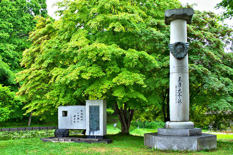 碑文より「明治10年4月16日札幌農学校教頭ウイリアムスミスクラークが島松駅逓所(中山久蔵宅)における学生および職員と決別した地を記念し昭和25年11月クラーク奨学会(発起人代表宮部金吾)により記念碑が建てられた。クラークは開拓使の招きにより明治9年6月東京へペンハロー、ホイラーの2教師とともに着任し7月札幌に赴任、同年9月札幌農学校教頭となり翌年4月までの8ヶ月間在任した。訣別にさいし青年よ大志を懐けの含蓄のある言葉を残したのは現在でも有名であり、塔央のクラーク像の下にはボーイズビーアンビシャスとその言葉が彫られている(村史要約)・以下クラーク年譜は省略」※中山久蔵翁の農場は札幌農学校の実習農場でもあったという。クラーク博士はこの農場で最後の講義をして去る事になるが、明治9年当時の島松駅逓所(北広島市の年表では明治13年から島松駅逓継替所)は島松川を挟んだ恵庭側だったので決別の場所は恵庭側という事になりそうだ。◇建立年:昭和25年11月 ◇建立者:クラーク奨学会 ◇所在地:北広島市島松1−1 ◇Gmap:マップコード