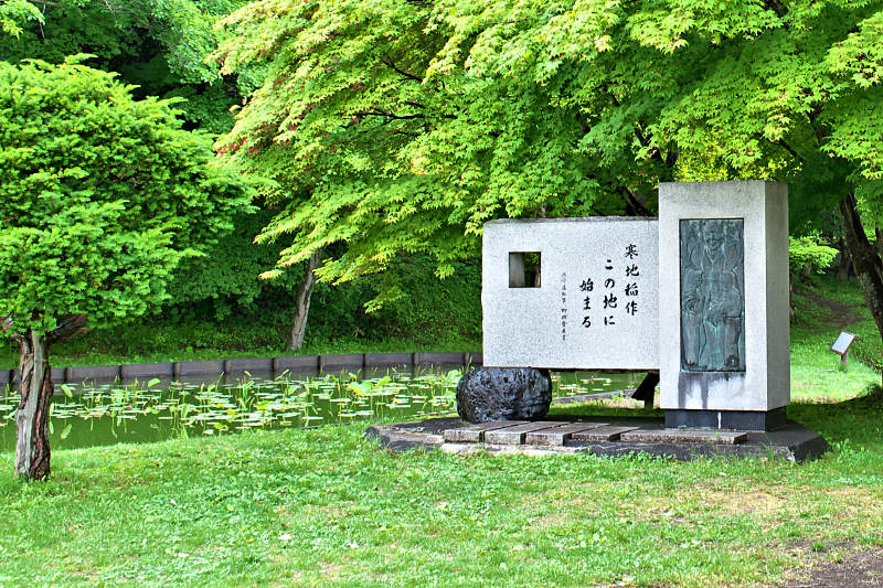 碑正面右側に「寒地稲作 この地に 始まる 北海道知事 町村金五書」左がには中山久蔵翁のレリーフがはめ込まれている。碑裏面の碑文より「ここは明治6年 大阪府出身 中山久蔵が最初に米作を試みたところとして永く記憶さるべき地である。当時道南地方を除いては北海道の稲作は危険視され、万全の開拓方策をたてることができなかったが、明治4年 単身卒先してこの地に入地し開墾に従事した久蔵は、あえてまずここに水田一反歩を開き、種子を亀田郡大野村から求めてこれを試み成功し、その安全性を証明したばかりだけでなく、その種子を道内各地の希望者に無償配布して成功せしめた。ために付近の水田耕作熱はとみに高まり空知、上川の穀倉を拓く基を拓きついに北海道を全国一の米産地に育てる因を作ったのである。昭和39年9月9日 北海道大学教授農学博士 高倉新一郎撰文 鈴木凌雲書」※石狩水田の祖と謳われ篤農家と云われる中山久蔵が、明治6年の稲作に成功した赤毛種の子孫に「ゆめぴりか」があるそうです。◇建立年:昭和39年9月9日 ◇建立者:不詳 ◇所在地:北広島市島松1−1 ◇Gmap:マップコード