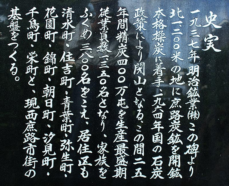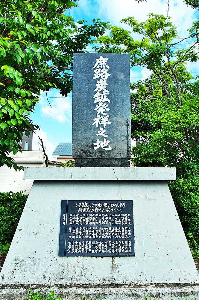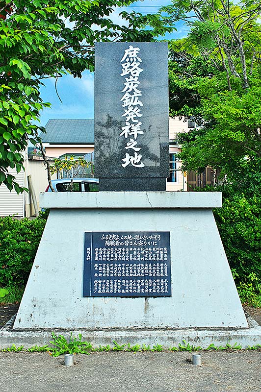 明治鉱業庶路炭鉱として昭和14年に開坑するが、太平洋戦争中は一時休山し戦後再開され、西庶路駅から庶路炭鉱までは専用線が敷設されていた。昭和36年に立坑が完成し昭和38年に最大出炭の35.8万トンを記録するも、脱石炭へのエネルギー政策転換に抗しがたく昭和39年閉山。正面碑文「庶路炭坑発祥之地」台座に「ふるき友よ、この地に思いをいたそう 殉職者の皆さん安らかに」とありその下に殉職者57名の氏名が記されている。裏面上の碑文「1984年7月吉日 閉山後20年を記念し同志当地に会し、この碑を建立する。」台座に「1973年明治鉱業(株)この碑より北1200米の地に庶路炭鉱を開鉱、本格採炭に着手、1964年国の石炭政策により閉山となる。この間25年間、精炭四百万屯を生産、最盛期、従業員数1350名となり、家族をふくめ3800名をこえ、居住区も清水町、住吉町、青葉町、弥生町、花園町、錦町、朝日町、汐見町、千鳥町、栄町と現西庶路市街の基盤をつくる。」とある。※昭和35(1960)年の大規模なガス爆発で死亡者18名、重傷者7名をだしているが、刻まれている殉職者はそれを遙かに超えるので小さな事故は頻発していたものか。西庶路コミュニティーセンター2階に「白糠炭田 石炭資料室」があります。