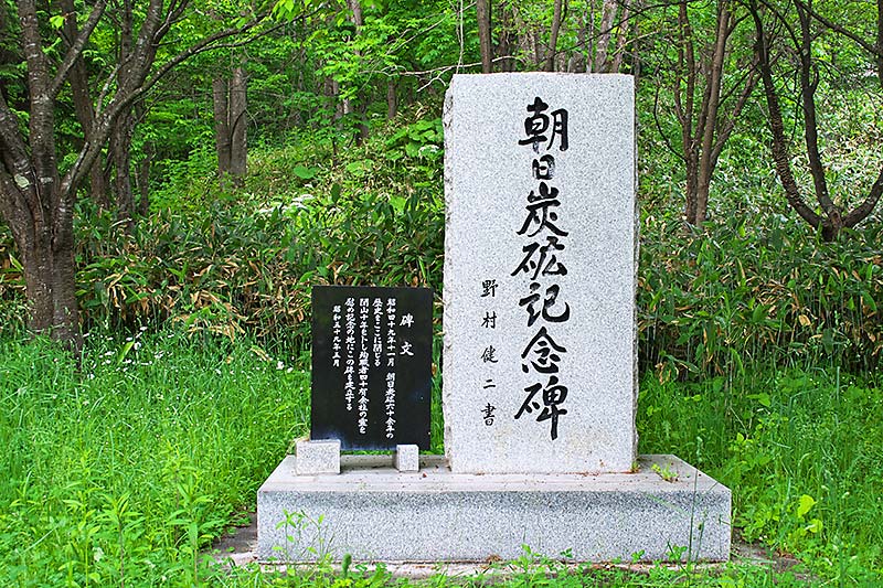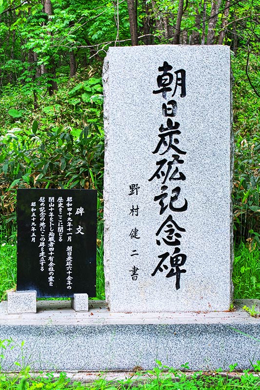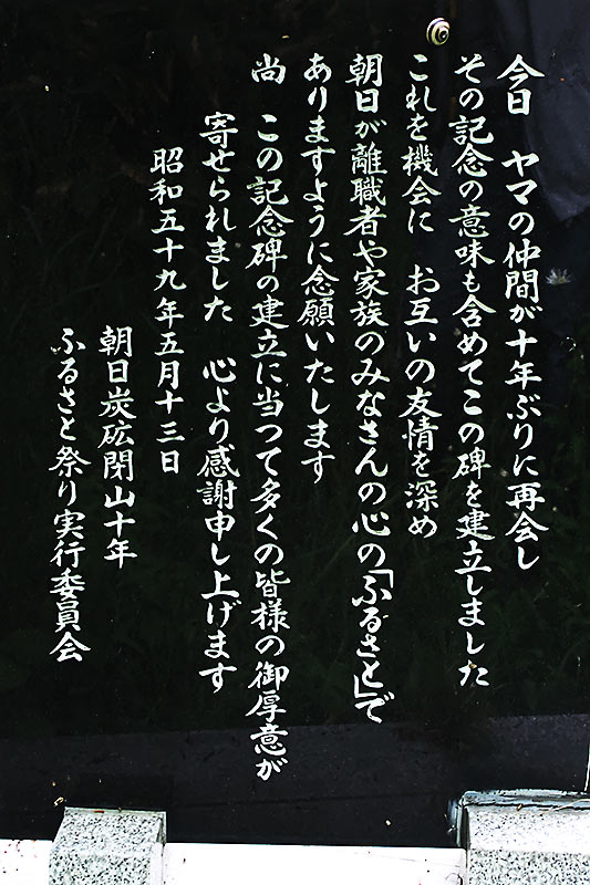 碑文「昭和四十九年十一月 朝日炭砿六十余年の歴史をここに閉じる。閉山十年を卜し殉職者四十有余柱の霊を慰め記念の地にこの碑を建立する。昭和五十九年五月 野村 健二 書」※明治末期から採掘され、戦後は大手に属さない朝日炭鉱株式会社(昭和24年以前は日本硝子株式会社)が経営にあたっていた。朝日駅が設置された大正8(1919)年頃から出炭規模を拡大、昭和40年代には10万トンを超える生産量を記録し、朝日駅北側に選炭場、駅北西部に炭鉱住宅が広がっていた。昭和47(1972)年2月のガス突出事故で9人が殉職、それが引き金となって昭和49年に閉山。事務所などの建物は既に撤去され痕跡はなく今は原野に還っているが、本坑口や斜坑口跡などの遺構が残っている。碑名は記念碑ですが慰霊の意味も込められているようです。