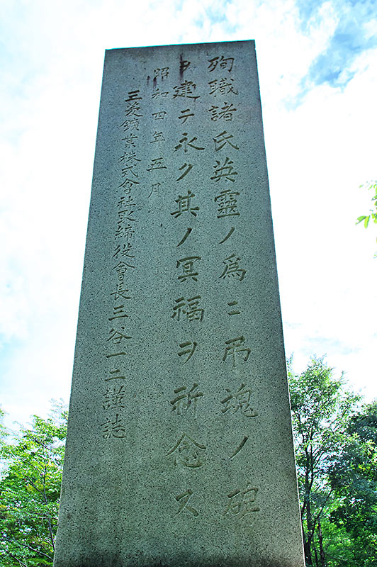 北海道炭鉱汽船株式会社が幌内神社境内に建立した追悼碑で位牌を納める構造、哀悼之碑本来の法塔部が欠けているが夕張の哀悼之碑は法塔部分だけが残っている。戦後になって現在地に移設されたが、その時に法塔部をうしなったものか・・碑の前が階段になり哀悼之碑の裏面に碑文が刻んである。各炭砿に建立された哀悼之碑で碑文が見られるのは三笠だけなので長文になるが全文を転載する。「本炭砿の我か會社の所有に歸したる以来既に十有七年事業は駸〻として進み行き遂に今日の隆盛を覩るに至れるもの職として世間の需要増加するに應し業務を擴長してそか供給を充たしめるに由るといへとも仰も亦炭礦のこと從う者取分け礦夫として勞役に服せし人〻の骨身を愔します艱苦を辭せす能く其業に勉め以て之を助けし功に歸せんはあらす燃るに其業を執の際不慮の變害に遇ひて命を殞し又は死傷して終に死に至り若しくは永く炭礦に從事して竟に其職に死せしもの尠なからす此等はいつれも我か事業のために忠誠を抽んてたる結果にして悼むへく哀しむへきの極みなりさされば此等の死亡者に對し禮を厚うし追遠弔祭の典を行ふこと我が會社の當然に取るへき道なりと思ふものから茲に哀悼之碑を建立し此等死者の位牌を納め殊に亦た毎年一度祭壇を設けて其冥福を禱るを以て我か會社の恒例とはさだめぬ因りて聊か事の由を碑陰に刻して不朽に傳ふと云ふ 専務取締役 井上角五郎」※建立当時から慰霊祭を執り行っていたようです。