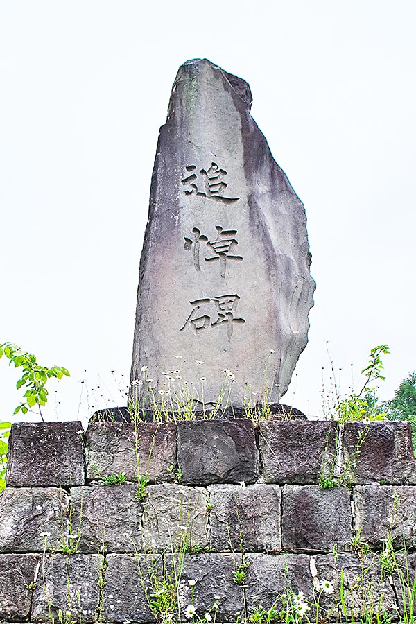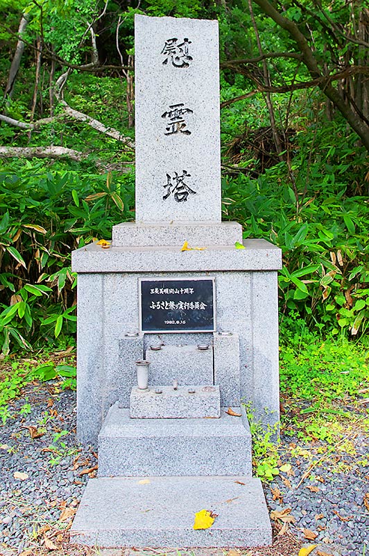 三菱美唄記念館の奥で川を越えたキャンプ場隣に「弔魂碑」と「慰霊塔」が並んである。「慰霊塔」の碑文に「大正4年三菱美唄炭砿開山 昭和47年閉山廃墟となる。60年に渡る故郷を偲ぶと共にこの山で殉職又病死された方々の冥福を祈るものなり」とある。三菱美唄での死亡者の名前や死亡者数は記されず、連行された朝鮮人や中国人の事も記されていないが、この山で殉職又病死された方々となっており、この炭砿でなくなられた方々を慰霊しているものと理解した。碑は閉山後の昭和52(1977)年6月に「ふるさと祭実行委員会 元三菱美唄居住者有志一同」が建立。「美唄の碑」では建立地が常盤台1区となっていたが、常盤台は殆どが自然に戻っており碑は現在地に移転されたものか最初から此の地に建立したのかは不詳。
