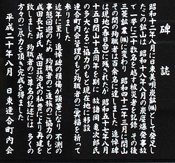 明治43年の試掘から始まった茶志内炭鉱は昭和12年日東美唄炭鉱と改称し大勝坑を開坑した。昭和19年に三菱鉱業に買収され、昭和23年に採掘区域を拡大するため茶志内通洞開削に着手。鉱区は三菱美唄炭鉱の滝の沢新坑、竪坑の北側になる産化美唄川沿いから美唄川に至る東西9km、南北3kmの区域で、生産量は最盛期で年20万トン程度でした。昭和42年に閉山している。日東町住吉地区にある墓地に再建された慰霊碑がある。昭和18年8月の炭塵爆発事故の被災者をはじめ、昭和42年閉山までの殉職者100余名の氏名が刻まれている。日本人の労働者のみならず連行されてきた朝鮮人・中国人の中からも多くの死者がでているとおもうが、その名前はないようです。