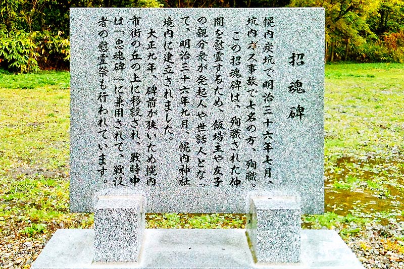 招魂碑の入口に指導標と碑誌があり招魂碑前は30段前後の階段になっている。台座は三段でその上に2m余りの自然石で出てきた招魂碑がある。碑誌より碑文を転載「招魂碑 幌内炭鉱で明治三十六年七月、坑内ガス事故で七名の方、殉職。この招魂碑は殉職された仲間を慰霊するため、飯場主や友子の親文衆が発起人や世話人となって、明治三十六年九月、幌内神社境内に建立されました。大正九年、碑前が狭いため幌内市街の丘の上に移設されて、戦時中は「忠魂碑」兼用されて、戦没者の慰霊祭も行われています。台座上段正面に山炭内幌(横書きで現在とは左右が逆の刻字で幌内炭山と同じ)、上段左右に世話人6名、上段裏面に建設発起者5名の氏名と建立年月、石工の氏名が刻まれている。三笠の炭鉱関連の慰霊碑としては最古の碑かもしれない。幌内炭鉱の遺構は殆どは解体され、巨大なズリ山がその歴史を語りかけている。