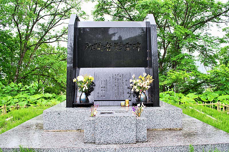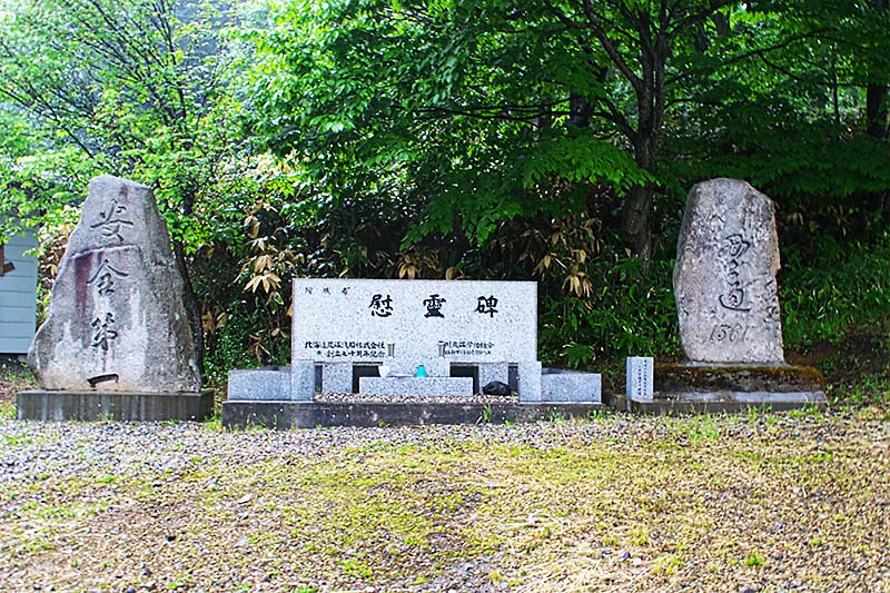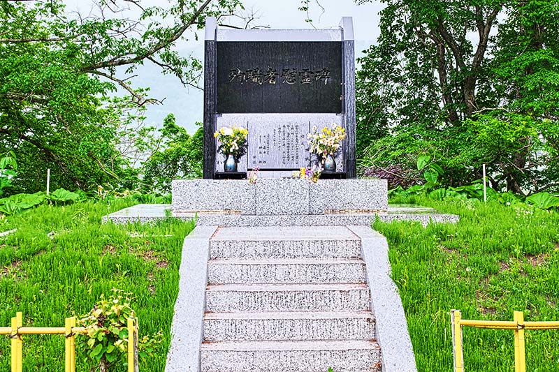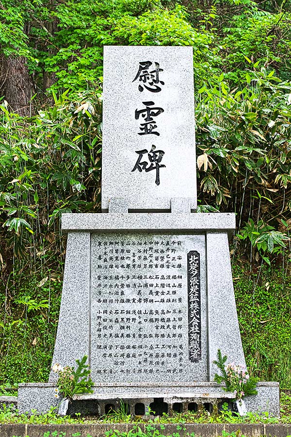 三菱美唄記念館の奥で川を越えたキャンプ場隣に「弔魂碑」と「慰霊塔」が並んである。弔魂碑は東美唄地区に建立され現在地に移設されたものという。碑文より「殉職諸氏ノ英霊ノ為ニ弔魂ノ碑ヲ建テ永ク其ノ冥福ヲ祈念ス 昭和4年5月 三菱礦業株式会社取締役会長 三谷一二謹誌」とあり弔魂碑の建立された年代から昭和2(1927)年の事故で亡くなられた方々の慰霊碑かもしれない。三菱美唄炭鉱では悲惨な事故が繰り返されたが、昭和2年の美唄炭鉱堅抗でガス爆発、39人死亡。昭和16(1941)年のガス爆発で177人(朝鮮人22人を含む)が死亡、この時は事故の2日後に坑道をコンクリートで閉鎖しているので、坑内に53人(朝鮮人14人を含む)の遺体が今なお地底にあるが、報道されることはなかったようです。昭和19(1944)年5月16日に北部第一斜坑でガス爆発で107(朝鮮人は70人以上?)人が死亡、昭和43(1948)年1月・ガス爆発で16人死亡。同年5月・大規模崩落で13人が死亡と事故が続き、昭和47(1972)年4月に閉山している。