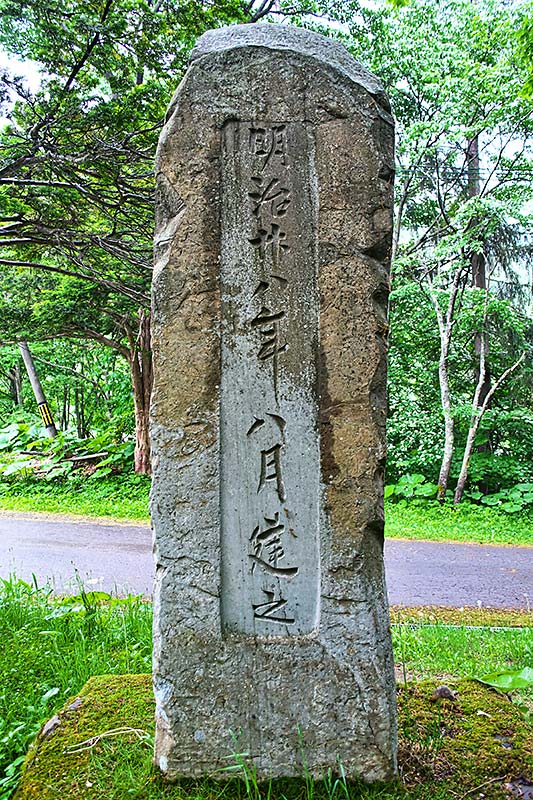 明治28年建立と夕張では最も古いと思われる高さ約 2.6 m、自然石の素材で作られた哀悼碑で碑正面に「礦業従事者遭難哀悼碑」裏面は「正四位西村捨三 明治廿八年八月建立」とあるだけで建立に至った経過は刻まれていない。建立者は西村捨三氏で官選により北炭社長に就任、重役公選制になるまで4年間社長の任にあった。何も無いのに哀悼碑を建立するはずもなく、おそらくは記録に残さなかった事故が頻発していたのでしょう。北炭の災害記録をみても出てくるのは碑の建立後からと云い、当時の北炭では死傷者20名以下の年度は記録が省略されているようです。当時はまだ水平坑3本と斜坑でやっと本格的な採炭に入り始めた頃であり、軍需景気で掘れば掘るほど利益が上がる時代でもあった。
