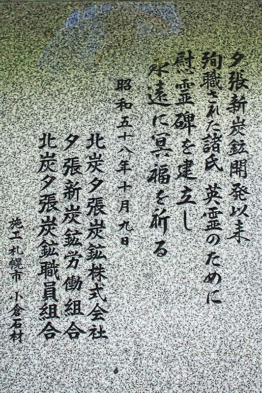 石炭産業と北炭の存亡をかけ昭和55年6月に営業出炭を開始した夕張新炭鉱で昭和56(1981)年10月16日にガス突出・坑内火災事故発生で坑内に行方不明者59名を残したまま注水、排水作業後に遺体の収容作業を再開され、残っていた遺体が収容されたのは昭和57(1982)年3月28日で、最終的に93名の砿夫たちが犠牲となった。この事故で行方不明者を残したままの注水作業がショッキングな出来事で炭鉱のイメージを一変させた。通洞は遺族の感情も配慮してかコンクリート密閉ではなく空気の通る格子で塞がれ「北炭夕張新炭鉱」の文字も往時のまま。戦後の炭鉱事故としては1963年の三井三池三川炭鉱炭塵爆発(福岡県大牟田市)の458人、1965年の三井山野炭鉱(福岡県嘉麻市)ガス爆発事故の237人に次ぐ3番目の大惨事で、再建を目指していた北炭には壊滅的な打撃を与えた事故翌年の昭和57年に閉砿しその翌年に慰霊碑が建立されている。北炭夕張新鉱連絡隧道口の右横にある盛土の丘に慰霊碑があり、台座の碑文より「夕張新炭砿開発以来殉職された諸氏英霊のために慰霊碑を建立し永遠に冥福を祈る。昭和58年10月9日 北炭夕張新炭砿株式会社 夕張新炭砿労働組合 施工者省略」また開砿から閉山まで7年間の殉職者120名の氏名が碑正面と両側面二段に刻まれている。