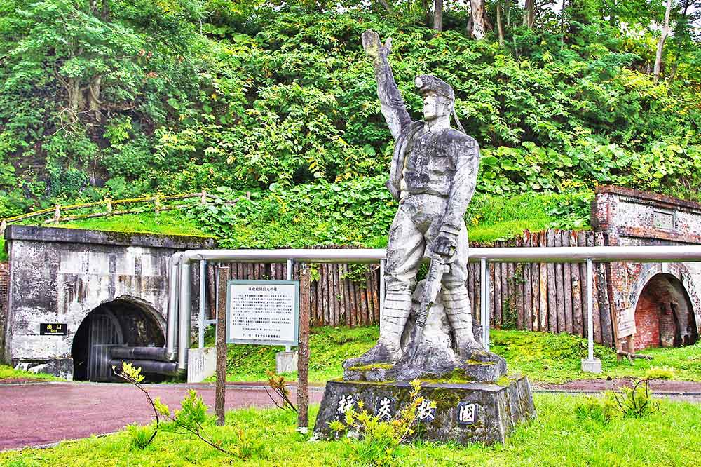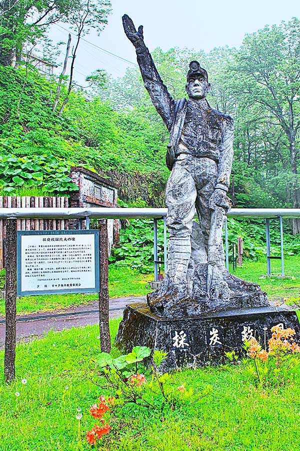 中村直人他三名で石炭産業に従事する人々を激励するため、昭和19年に現地で製作され旧夕張鉱業所前に「採炭救国」として設置されたもの。軍需美術推進隊という団体の依頼で戦意高揚と戦時経済を支えるため美術家も動員されて出来た戦時文化遺産ともいえます。戦後は経済復興を進める中で「採炭救国坑夫像」と呼ばれたようです。この像は旧夕張鉱業所前から新二鉱繰込所前に移設され、更に昭和60年に石炭の歴史村にある天竜坑の露頭炭前に移された。素材が少ない鉄筋とセメントなので経年変化による痛みは激しいが、痛んでもコンクリートで有る事に意味がある。上砂川などではレプリカに差し替えられているが、戦前という特別な状況の中で作成された臨場感は伝わってこなかった。モデルは鉱業所長の竹鶴可文(よしふみ)という。