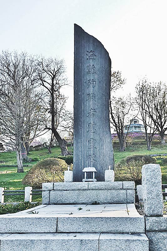 市街中心部の高台にある紋別公園の入口正面にテトラポット台座にした例を見ない港湾殉職者慰霊碑。碑文正面・裏面とも「港湾殉職者慰霊碑」と刻まれ、裏面に「昭和四十四年六月 建立 紋別市長 宮尾貫市 殉職者氏名(注・氏名省略12名省略) 株式会社西村組 紋別事業所 従業員一同施行」※紋別発展を支えた港湾整備の陰に尊い犠牲がありました。大正11年に暴風雨による大きな犠牲をだした海難事故があり、その翌年から本格的な港湾建設が始まり昭和5年度に完成、その後も拡張工事が続けられ現在に至っている。西村組も港湾整備に携わった業者であり関係者が殉職されたのだと解釈した。港湾工事が始まった年代からして、強制労働による犠牲者もいたのではとこちらも気きなります。
