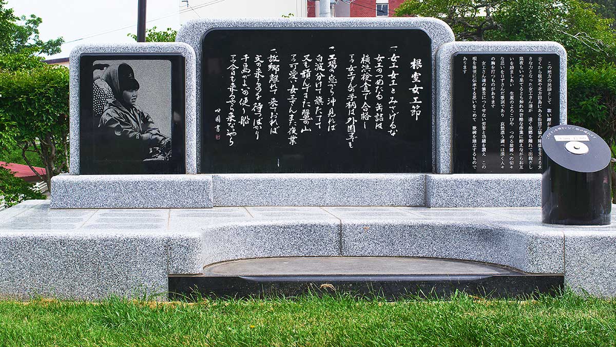 説明碑碑文より「この地方の民謡として 歌い継がれてきた根室女工節は 古くから根室や北方四島にある缶詰工場の隆盛を支える大きな力となった女工さん達が 遠く故郷を離れて出稼ぎし 幾夜もいつ果てるともしれぬ過酷な作業に耐えながらお互いを励ましあい 生産のよろこびや つのる故郷への切々な思いを口ずさんだ歌詞であり 哀愁漂う調べは深く人々の胸を打つものがあります 女工さん達の筆舌に尽くせない労苦と功績を讃え この唄を後世に伝承する思いを込めて この歌碑を建立するものであります」※女工節にはいろいろな歌詞がありそのなかの一つに「缶詰工場に二度来る子は 親のない子か まま母育ち 親のない子は泣き泣きかせぐ アラ 監獄部屋より まだつらい」など女工節の歌詞には過酷な労働環境や悪徳周旋屋の暗躍が垣間見えるのもあり、言い換えるならこれは北の女工哀史、手動の押しボタンスイッチで根室女工節が流れます。参考文献として合田一道著「流氷の海に女工節が聴える」をあげておきます。