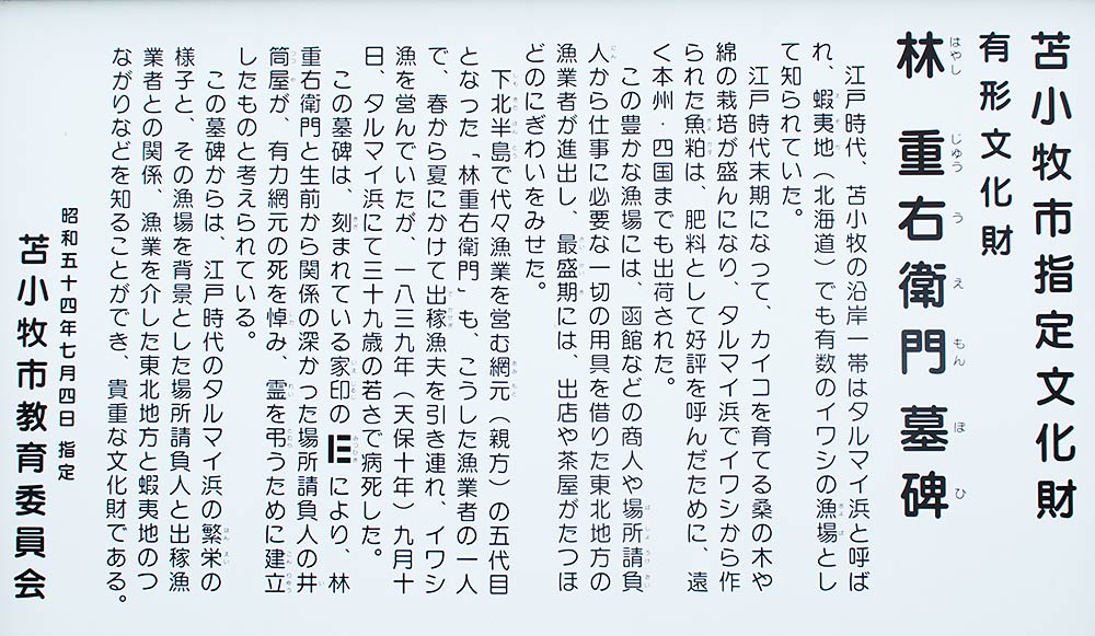 江戸時代から明治にかけ勇払から白老に至る一帯は樽前浜と呼ばれ、5~6月頃からマイワシを地曳網で獲るイワシ漁が盛んでイワシは〆粕(しめかす) に加工されていまた。当時は樽前浜一帯の殆どが場所請負人の請負場所で漁場の多くは東北などからの出稼人達に支えられていた。出稼人達は漁獲の二割を請負人に支払い、八割が自分たちの取り分となる仕組みで俗に「二八取り」とも呼ばれた。この時期は樽前浜のイワシ漁業が大規模漁業として確立した時期とされ、林家は南部易国澗で漁業を営む網元で、天保2(1831)年、酉松(とりまつ) と名乗った5代目が重右衛門(じゅうえもん) も毎年、樽前浜にやって来て大勢の漁夫を指揮してイワシ漁業を行っていたが、襲名から7年後の天保8(1837)年に、39歳の若さで重右衛門は樽前浜で病死しました。墓碑に林家の|三(みつひき)の屋号があり、箱館の場所請負人、井筒屋大橋久右衛門 が、林重右衛門の霊を弔うため建立したものと考えられている。弘化2(1845)年にこの地を訪れた松浦武四郎は 『初航蝦夷日誌』の中に「豊漁期にはアイヌの使役もあって樽前浜は商人の出店や茶屋も建つほどの盛況を極め、その繁栄は東部第一なり。」と記している。昭和54年7月4日に苫小牧市指定有形文化財となっています。