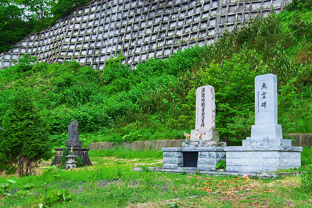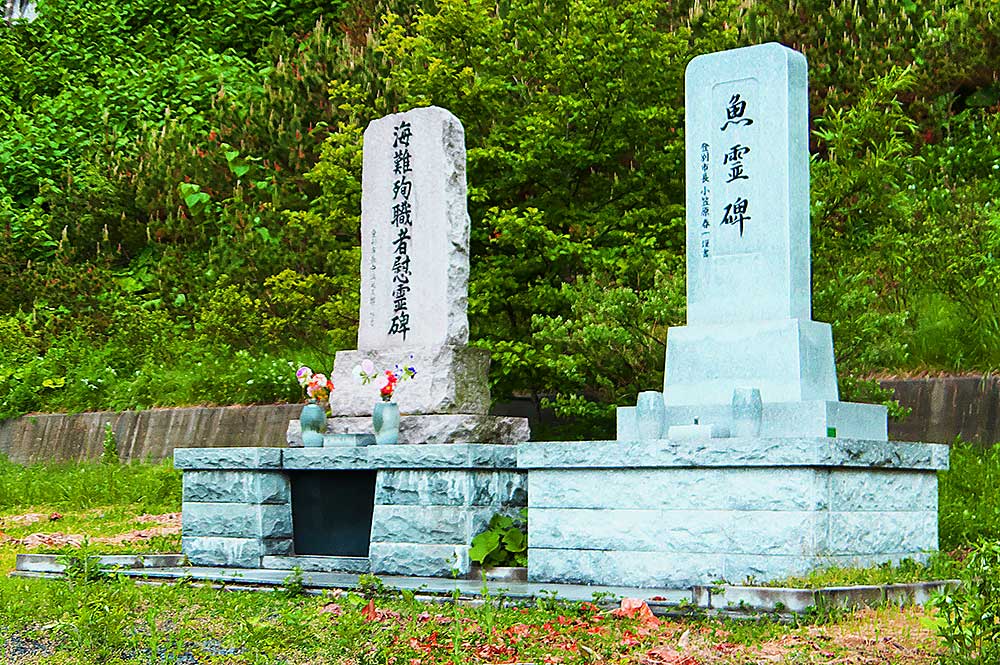 いぶり中央漁協の白老地区水難者慰霊碑は45柱が祭られている。昭和5(1930)年8月12日、山田三蔵(49歳)が子息ほか11名で電気着火式機関を取り付けた川崎船でイカ釣りに沖へ出航。急な時化に遭い転覆、全員不明。昭和15(1940)年4月12日、須貝作次郎所有の第13松島丸は船長ほか6人を乗せてメヌケ延縄漁に出漁。就寝中一酸化炭素中毒により須貝留治(18歳)ら18歳から55歳の乗組員6人が死亡。昭和30(1955)年7月21日、中部サケマス流網漁のため弥栄丸に乗船、千島オンネコタン島沖で操業中浸水沈没。渡辺富蔵(33歳)ら19歳から33歳までの乗組員10人全員が不明というが、これ以降については記録に残るような大型海難事故は起きていないものとおもわれる。並んで昭和8年10月10日建立の漁霊供養碑が建っている。