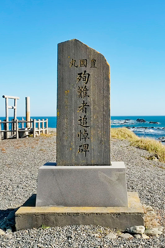 碑表刻文「豊国丸 殉難者追悼碑 海軍中将正四位勲二等功五級四竃考輔 書」由来「昭和4(1929)年4月22日、午前6時函館港を出港した函館市長長谷川藤三郎所有、柿野紹介扱い汽船「豊国丸(ほうこくまる)」(2,343トン、高井甚三船長以下33名)が、函館市西浜町28番地株式会社八木本店の漁夫176人を乗せて、カムチャッカ東海岸アナッターチャーへ向け航行中、襟裳岬にて座礁し沈没。78名が死亡され追悼碑が建立された。平成3年2月の嵐で根元から倒壊したが台座を修復し再建している。裏面の刻文は風化が進んでいて殆ど読めません。
