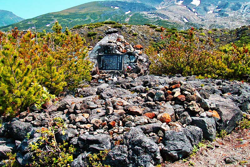 この碑は昭和37年の十勝岳爆発で殉難された方を慰霊した碑です。建立の由来「昭和37年6月29日午後11時40分に十勝岳爆発により、硫黄採掘していた磯部鉱業所の元山宿舎に宿泊していた気象台技官2名、磯部鉱業所鉱員十四名が避難中に鉱員5名が降りくる火山弾の直撃を受け亡くなりました。「十勝岳爆発記念碑」の表面下部に「銘 昭和38年8月8日この碑を建立するに当り、当時殉難の5氏を悼むと共に、山岳無縁物故者の霊を慰む。児玉 豊 菅原 隆夫 井上 清 小野 寺庄一 高橋 倫照」※犠牲となった5名の慰霊と山岳無縁物故者の霊を慰むため美瑛町が慰霊碑を建立した。除幕式は昭和38年8月5日に関係者多数の参列する中で犠牲になった「故高橋倫照氏」の遺児、長女照子さんの手により碑の除幕が行なわれた。