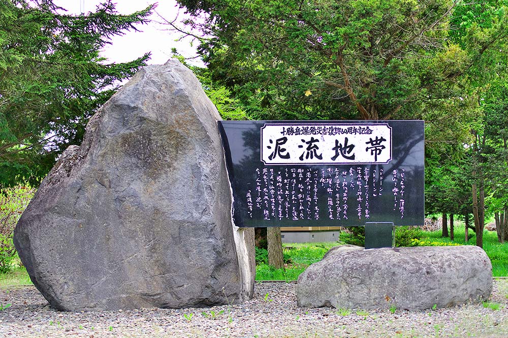 十勝岳爆発災害復興60周年記念碑です。大正15年5月24日の十勝岳噴火は残雪を溶かして押し寄せた泥流は、144名の尊い人命を奪い開拓以来築いてきた沃野を泥田と化した。火山災害史上でも上富良野の歴史の中で最も悲惨で最も大きな災害でした。壊滅的な災害に敢然と立ち向い今日の沃野に復興した先人の努力も、過去の出来事として忘れ去られようとしてい今、先人の努力と開拓精神の気風を次代に引継ぐことは現代に生きる者の責務である。十勝岳爆発から60周年を迎えんとするときに、旭川在住の作家三浦綾子さんが、十勝岳爆発の惨事と当時の人々の復興に到る不屈の精神を克明に描いた小説「泥流地帯」を発表された。綿密な調査と多量の資料を基に描いた小説「泥流地帯」により、私達に復興不能といわれた災害を乗り越えた先人の偉大な精神を再び甦らせてくれた功績を讃え「泥流地帯」の文学碑を富良野地方開拓発祥の地であり、十勝岳爆発被災に直撃された草分地区に建立した(※十勝岳爆発災害復興60周年記念碑建立趣意要約)。隣接して十勝岳爆発当時の上富良野村長・吉田貞次郎の住居を移設した上富良野町開拓記念館がある。碑文「ドドーン ドドーン 大音響を山にこだましながら、見る間に山津波は眼下に押し迫り、三人の姿を呑みこんだ 以下省略」※碑文は小説「泥流地帯」の一文で、題字は著者の三浦綾子さん揮毫。碑の建立は十勝岳噴火「大正泥流」から60年後ですが、それから時は進み90年をこえた。災害は人々の記憶から消えた頃にやってくる、あの大津波のように。
