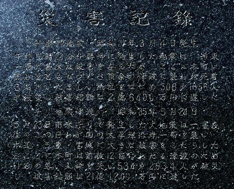 災害記録として昭和27年3月の十勝沖地震では流氷をともなった津波で甚大な被害と3名が犠牲となる。昭和35年の南米チリで発生した大地震で発生した津波が12回にわたって沿岸を襲い11名の犠牲者をだしたと記してある。昭和52年の建立?らしく、東日本大震災の被害は含まれていない。