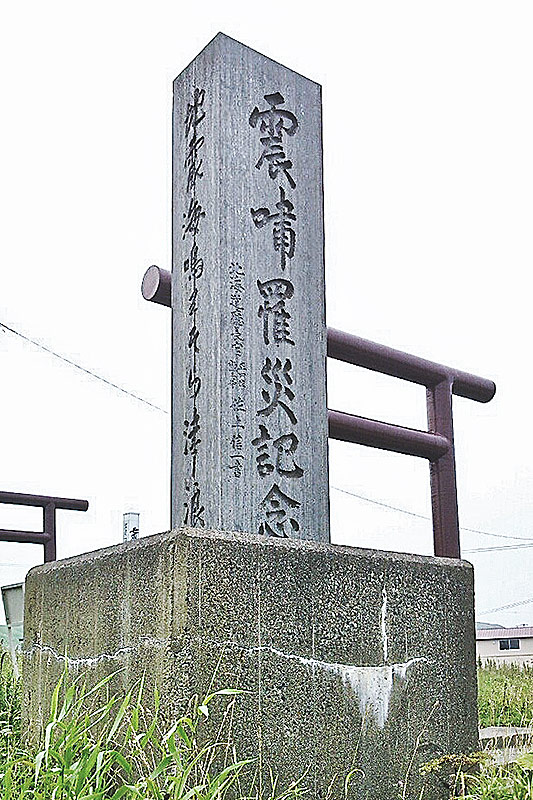 碑文は「震嘯罹災記念」「北海道廰長官正四位勲三等佐上信一著」左側面は「昭和八年12月建之 地震海鳴里そら津浪」「この記念碑は朝日新聞社へ寄託□義金二十餘萬圓を罹災町村へ分配した残額をもって建てたものです」※昭和8年3月3日未明、三陸沖で発生した地震による津波が幌泉村を襲い、えりも岬地区、庶野地区を中心に大きな被害が生じた。津波は地震発生後30分間の間隔をおいて3回来襲し、3回目には、その波高は14.2mにも達し、死者13名、負傷者56名、家・建物の倒壊90棟など総額34万円(現在の貨幣価値に換算して約20億円)の被害があった。この碑は被害の生じた町村へ分配された義援金の残額を使って建立され、地震の恐ろしさを後世に伝えている。明治にも三陸沖で発生した地震による海抜4mの津波に襲われているが、被害の程度は不明。