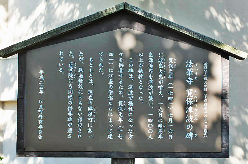 本町の高台にある法華寺は約480年前に上ノ国で創立され、寛文5(1665)年に現在地に移転し享保6(1721)年に本堂を建立したという。案内板(観光ガイド成翁山法華寺)があり、その中に「大島爆発淪没者供養塔と過去帳、246年前、寛保元年7月15日向かいの大島が爆発し、津浪が起きて死者1,467人の溺者の供養塔と当山関係過去帳がある」としるされていた。碑は境内左手奥にあり高札の説明文を転載する。「道指定文化財(平成4年3月31日指定) 法華寺 寛保津波の碑 寛保元年(1741)7月16日に渡島大島が噴火、19日に渡島半島西海岸を襲い、1400人が犠牲となった。この碑は津波で犠牲になった方々を供養するため、寛保元年(1741)に江差の僧侶たちによって建てられた。もともとは陣屋町にあったが、鉄道敷設にともない移設された。正覚院にも同様の供養費が遺されている。 平成25年 枝幸町教育委員会 (注)漢数字はアラビア数字に変更」渡島大島は8月18日(新暦)に西山から噴火し、8月25日からは降灰のため江差では昼も暗くなる。8月29日に大津波が発生したが、津波の原因は噴火による大規模な山体崩壊によるという説と、低周波地震によるものとの説があるが、かなりの期間噴火が続いたようである。案内板には噴火が246(現・278)年前とあり30年以上前に書かれたもの。その他に樹齢400年を超える「欅」樹齢260年の「椿」が境内にあります。※内部見学の際は事前問合せ要
