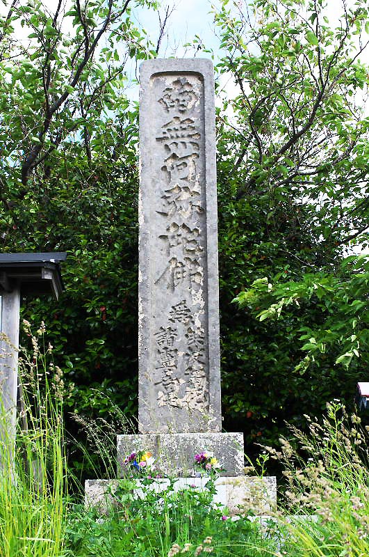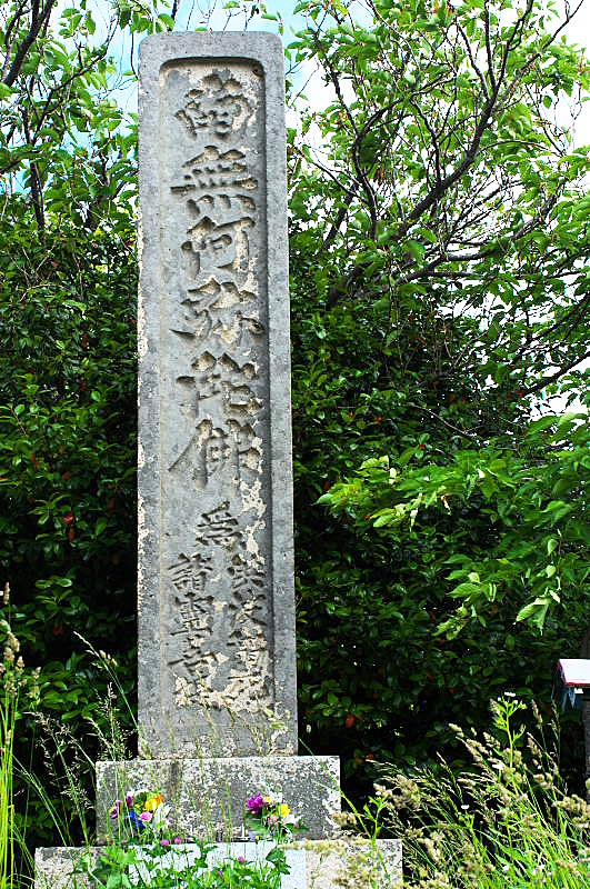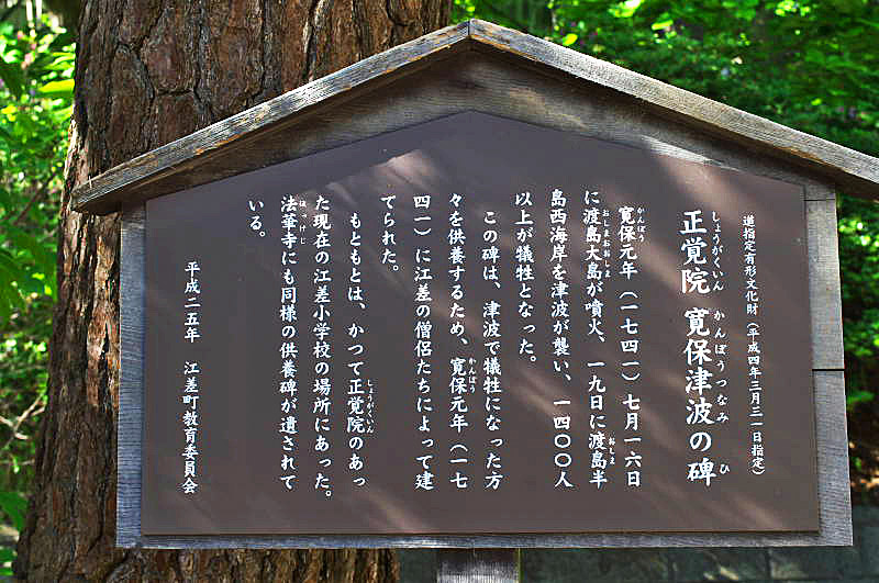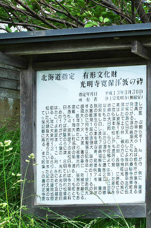碑の表は「南無阿弥陀仏為 洪波溺死 諸霊菩提 寛保元年辛酉七月十九日」とあり判読に問題はないが裏面は読めない文字が多い。供養碑の隣にある説明板わ転載。「北海道指定有形文化財 光明寺寛保津浪の碑 指定年月日 平成13年3月30日 所有者 浄土宗光明寺(無縁堂) 松前は、日本海に面する狭隘な地に集落が発達しているため、海難・風水害の発生頻度は非常に高かった。このうち最大の被害をもたらしたのが、寛保元年(1741年)に発生した大津波である。記録によれば、同年7月16日、日本海上に浮かぶ離島大島が突如大噴火を起こし、同年19日の早朝に大津波が来襲した。この津浪は、松前弁天島から熊石村(※八雲町熊石)までの諸村に大被害をもたらした。溺死する者1,467名、家屋倒壊790戸、破船大小1,521隻にのぼり、甚大な被害をもたらした。また、津浪の被害は、佐渡や青森地方にも及んでいる。松前藩の記録「福山秘符」によれば、同年8月8日、光善寺の発願により各寺院の僧が集まり、光明寺境内に卒塔婆を建て施餓鬼供養を行ったとされている。この供養塔は「福山秘符」の記述によれば翌年(1742)に光善寺が供養のために光明寺(無縁堂)を建立した時、卒塔婆に代えて建てられたものである。江差町の法華寺、正覚院及び松前町泉龍院の供養塔並びに熊石町無量寺の地蔵座像とともに大津波の惨事を今に伝える貴重な歴史資料である」※最初の噴火で津浪が発生した訳ではなく噴火を繰り返す中で津浪が発生したようだ。寛保津浪の碑は松前市街の端で道道434号線沿いの山側に建っている。