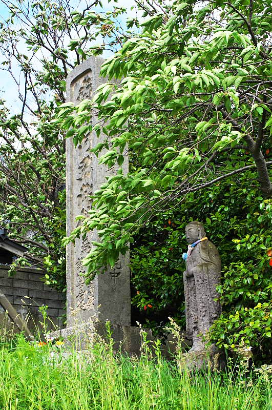 寛保津波の碑とあるが碑ではなく座位の地蔵尊です。説明書きより転載するが津浪に関して重複する部分は省略した。「・・・大島の対岸である松前町江良地域に被害が最も大きく「津軽藩日記」によれば「ゑら町」では「370人程他旅人80人程」の死人が出たと記録されている。現在の江良地区は松前町では本町に次いで戸数が多く、近世期でも福山から江差に至る集落の中では上ノ国に次ぐ規模であった。当時の江良地区の人口は不明であるが、津浪から約70年前に記録された「津軽統一志」によれば、寛文9(1669)年には家数70軒と記されており、この津浪によってその規模の集落が壊滅的な被害をうけた事は想像に難しくない。津浪の被害を乗り越え、江良町村が集落として機能を回復するには相当の時間を要した。生き残った人々が泉龍院に集い貫宗が中心になって、この供養塔を建立し、犠牲者の菩提を弔ったのである。以下省略」※寛保津浪による全死亡者の3割以上が江良地区と云う壊滅的な被害をだした。