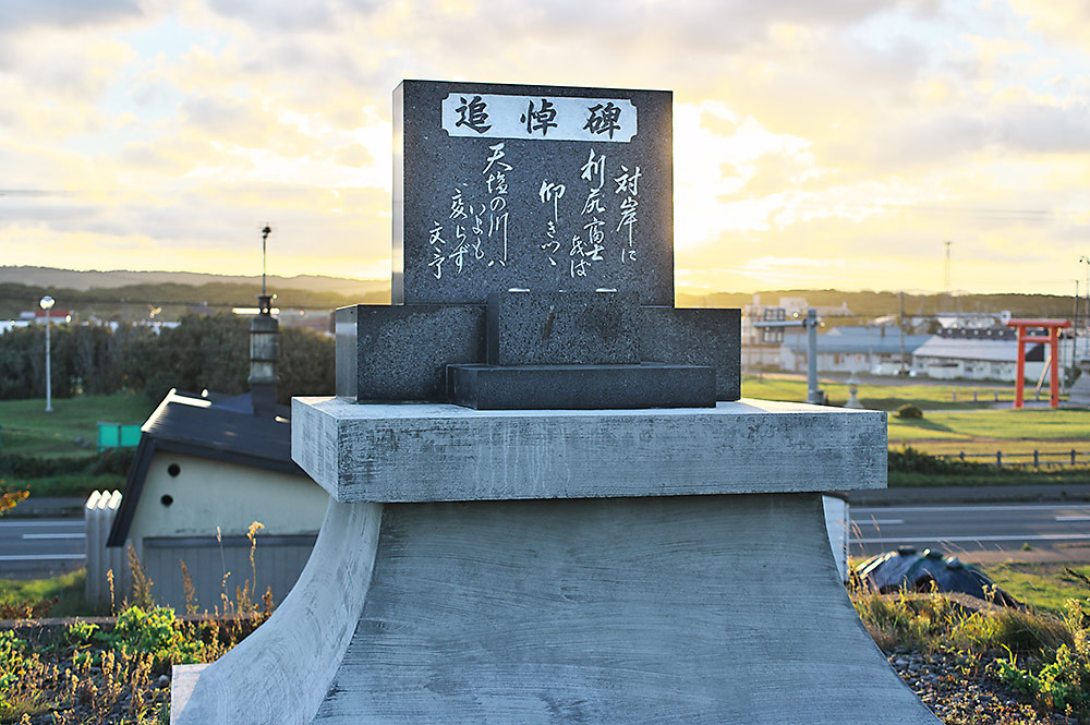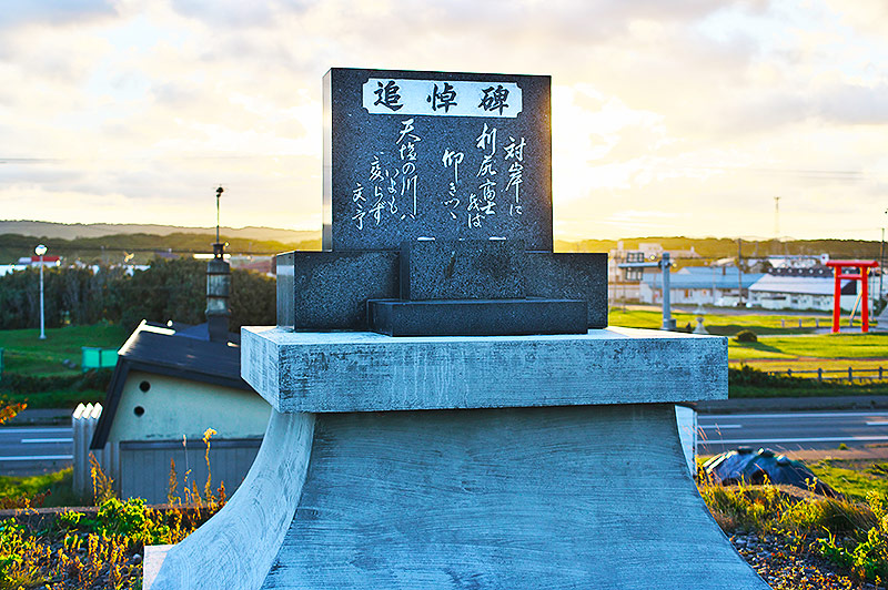 昭和15年の神威岬北西沖を震源地とする地震(M7.0)による津波で、天塩川口は約2mの津波が来襲し11(10名?)名の方が犠牲になった。8月の沿岸で猟期の真っ最中だった事から、天塩川向かいの砂丘にあった十数軒の番屋に漁師たちが寝泊まりしていた。地震による津波はバラック建ての番屋はひとたまりもなく押し流し、深夜であったことも災いして多くの犠牲者が出た。犠牲者には子供が多かったというが、学校が夏休みに入り普段は市街地で留守番をしていた子供たちも父の所に泊まりに行き被害にあったようである。昭和47年8月の33回忌に追悼碑が建立されている。碑には「対岸に利尻富士をば仰ぎつゝ手塩の川は今も変らず」と奇跡的に助かったという浅野文予さんの歌が刻まれている。