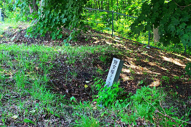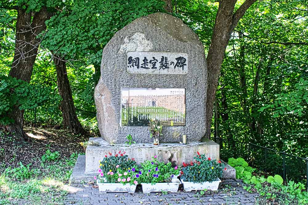 碑文を転載して説明にかえる。太平洋戦争末期の一九四五年 (昭和二十年) 七月十四、十五日、北海道各地は米艦載機の空襲を受けた。七月十五日午前、網走地方にも四が襲来し、ロケット爆弾と機銃掃射により十四名の尊い命が失われた。ゆかりのこの地に碑を建て、犠牲者の霊を弔い永久の平和を祈る。(注・犠牲となった14名の氏名が刻まれているがここでは省略) 一九八九年 (平成元年) 七月十五日 網走空襲の碑建立委員会」※道路沿いにある碑の建立後に書き加えられたと思われる氏名あり、犠牲者は15名ということになるようです。碑の周囲に防空壕(タコツボ)が再現されている。