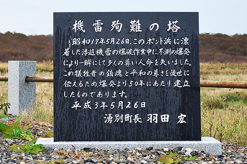 事故から約一か月後の6月5日、事故現場で合同慰霊祭が執行され翌年の昭和18年に事故現場に「殉難者慰霊碑」が建立された。波によるポント浜の浸食が激しくなり8年後の1951(昭和26)年に湧別神社境内に移転したが、ポント浜の護岸工事が完了した50年後の1991(平成3)年に殉難者慰霊碑が再建された。かつてのハマナスの群生地は町営牧場の牧草地となり、波打際を護岸で固められたポント浜に建つ機雷殉難の塔だけが当時を物語る。 ◇建立年:平成3年5月26日 ◇建立者:湧別町 ◇建立地:紋別郡湧別町東 ポント浜 ◇Gmap:Gマップ