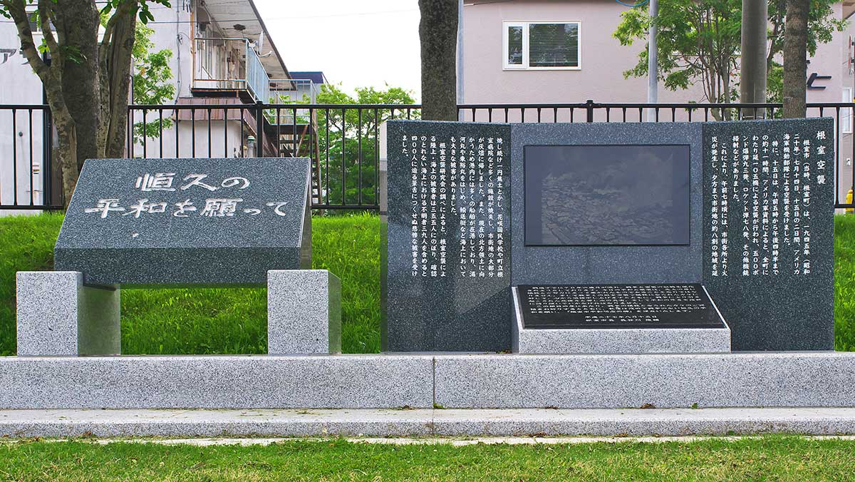 根室市では、平成23年3月18日に「非核平和都市宣言」をしました。美しい自然に囲まれた郷土と、明るく平和で安全な郷土を後世に引き継ぐことは、私たち根室市民の責務でるとして根室空襲70周年を機会に、空襲の記憶を後世に引き継ぐ事と戦争のない平和な社会を築くこと、空襲で亡くなられた方々の追悼の意味も込め平和祈念の碑が建立された。碑文より「戦後すでに70年の歳月が流れ、戦争と空襲の記憶も風化されようとしております。今日の平和と繁栄は、先人の尊い犠牲とご努力によって築かれたものであることを忘れてはなりません。そして数多くの根室空襲で犠牲になられた方々に対して、心から追悼申し上げますとともに、戦争により引き起こされた悲惨さと苦しみの真実、そして平和の尊さを後世に語り継いでいかなければなりません。この節目の年にあたり、戦争の犠牲となられた方々のご冥福をお祈りするとともに、私達は改めて戦争のない恒久の平和を願い、根室市平和祈念の碑を建立いたします。平成27年8月15日 根室市長 長谷川 俊輔」※終戦前の昭和20年7月14・15日のアメリカ軍による空襲で市街地の8割が消失し、およそ400名近い方々が犠牲となった。調査で判明した犠牲者355名の名前が記された石版が貼りあわせてあるが、また39人の確認出来ていないという。平和祈念の碑は鳴海公園内にあります。