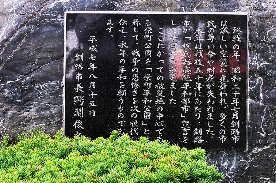 釧路市栄町7丁目の栄町平和公園に地上から伸びた2本のアーチが上部で一体となった平和のモニュメントの後方に昭和45年8月に建立された戦災記念碑が建っている。正面碑文より「戦災記念碑 ここにあった悲しみと 苦しみの日を 永久に 語りつがねば ならぬ」裏面の碑文「趣意 太平洋戦争末期の昭和20年7月14日午前5時23分と午後2時40分及び15日早朝の三面にわたり釧路市は米軍艦載機による爆撃をうけた、被害は次の通りである。死者177名、重傷者46名、継承者97名、消失家屋1,373戸、倒壊家屋1,618戸、被災者6,211名、消失面積6万坪19.8㏊。常時被災の中心地がこの区域であったことから、昭和30年区域住民の発願によりこの地に假標柱をたて爾来例年8月13日に慰霊祭を執り行って来たが、戦後25年の星霜と街区の大変貌期を迎え全市民の協力を得て今日こゝ永久碑として、戦災記念碑を建立するに至ったものである。昭和45年8月13日 西暦1970年8月13日 釧路市戦災記念碑建立期成会」とあった。またモニュメントの前に平和公園「命名記念碑」があり正面に「栄町平和公園」裏面に「終戦の年、昭和20年7月釧路市は激しい空襲に見舞われ、多くの市民の尊い命や財産が失われました。本年は戦後50年にあたり、釧路市が『核兵器廃絶平和都市』宣言をして十周年を迎えました。ここにかつて被災地の中心である栄町公園を『栄町平和公園』と改称して、戦争の悲惨さを次の世代に伝え、永年の平和を願うものである。平成7年8月7日 釧路市長 鰐淵俊之」と刻む。平成7年8月15日建立の「平和のモニュメント」と同じ戦後50年の年に改称したのだった。