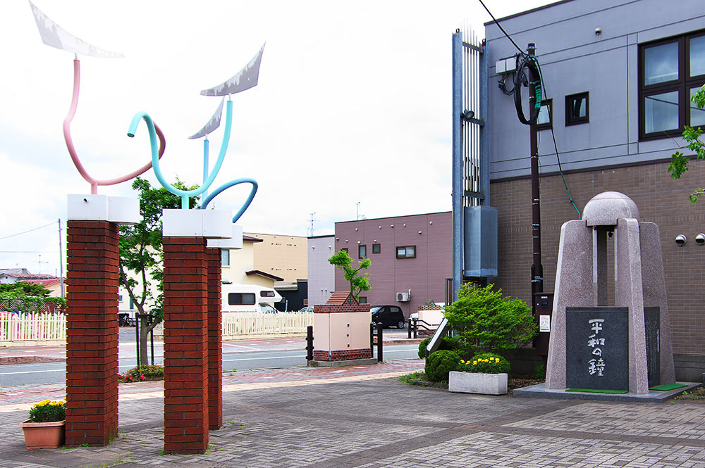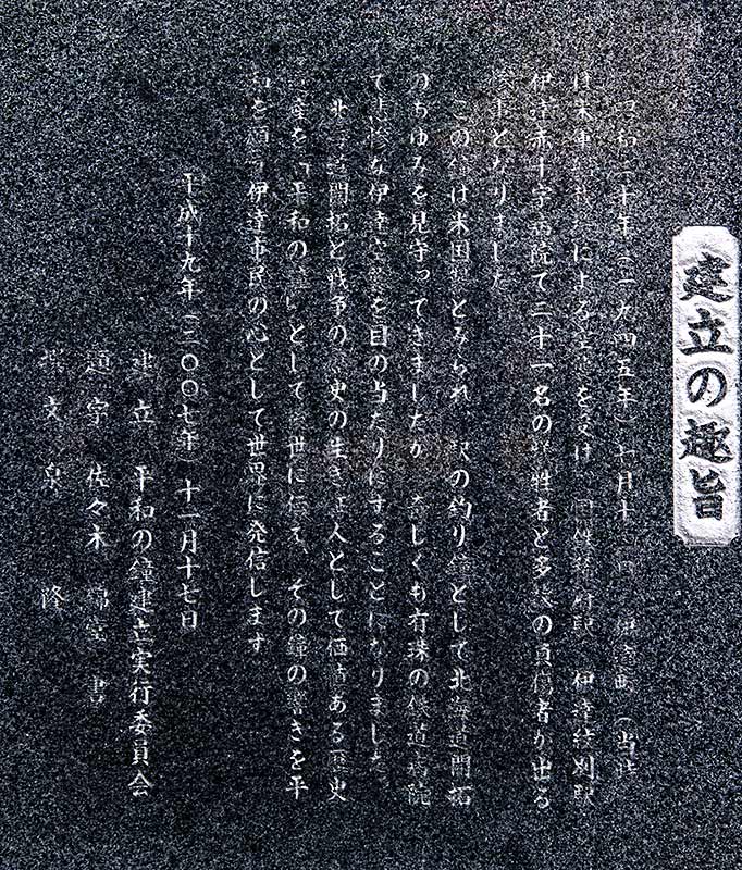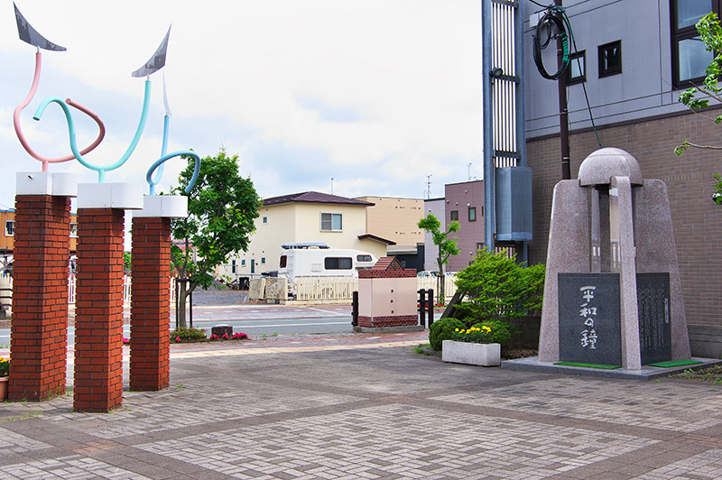 JR伊達紋別駅前通りの一角にある鐘の形をした平和記念碑。建立の趣意より「昭和20(1945)年7月14日、伊達町(当時は伊達町)は米軍艦載機による空襲を受け、国鉄稀府駅・伊達紋別駅・伊達赤十字病院で21名の犠牲者と多数の負傷者が出る惨事となりました。この鐘は米国製とみられ、駅の釣り鐘として北海道開拓の歩みを見守ってきましたが、奇しくも有珠の鐵道病院で悲惨な伊達空襲を目のあたりにする事になりました。北海道開拓と戦争の歴史の生き証人として価値ある歴史遺産を『平和の鐘』として後世に伝え、その鐘の響きを平和を願う伊達市民の心として世界に発信します。平成19(2007)年11月17日建立 平和の鐘建立実行委員会 題字 佐々木錦堂書 撰文 泉隆」※日本が行った侵略戦争の結末が米軍による赤十字病院攻撃など無差別な伊達空襲でした。それが忘れられた時に再び戦争の危機が訪れる、生き証人の存在価値もそこにあるのでしょう。伊達赤十字病院では小型爆弾投下で4名が犠牲になり8名が負傷、平成7年8月に病院敷地内「空襲犠牲者慰霊碑」が建立され例年7月14日に慰霊祭を執り行っているとのこと。