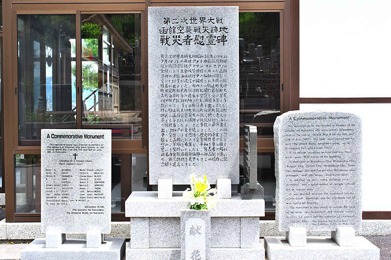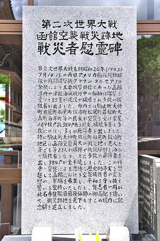 慰霊碑の碑文で説明にかえます。碑文表上段「第二次世界大戦 函館空襲戦災跡地 戦災者慰霊碑」碑文表本文「第2次世界大戦の末期昭和 20 年(1945)7月 14・15 日の両日 アメリカ艦隊機動部隊の戦闘爆撃機グラマン・コルセア 50 余機により主要攻撃目標であった函館港内や津軽海峡航行中の船舶は爆撃を受けて 85 隻が沈没や破壊され多数の犠牲者がでました。市内では駒止町 天神町 旅籠町 舟見町 鍛冶町 松風町 若松町 大森町 海岸町 等の民家が空襲を受け家屋 169棟 戸数 384 戸余を消失。破壊家屋も多数にのぼり、多くの死傷者を出しました。特に駒止町 天神町 旅籠町 舟見町 鍛冶町地区は函館空襲最大の戦災地で老人と子供等 23 人が爆弾や機銃掃射を浴びて犠牲者となり、また多数の負傷者を出し 384 戸が全半焼しました。この戦争・空襲による悲惨な歴史的事実を想起した函館における空襲犠牲者の霊を慰め、軍縮を希求し、 平和を守り抜く誓いを堅持いたしたく、有志一同が称名寺住職 須藤隆仙師 の御高配を頂いて、戦災跡地を見下ろすこの境内に記念碑を 建立しました。」