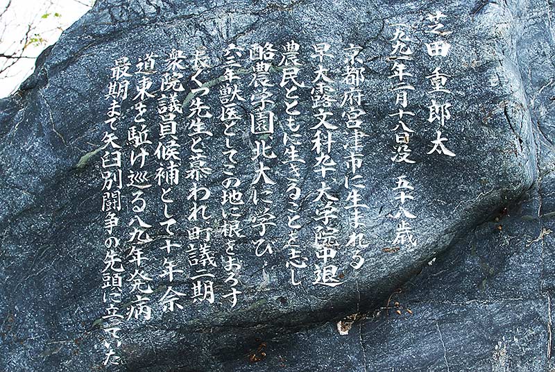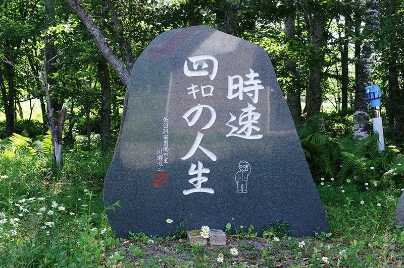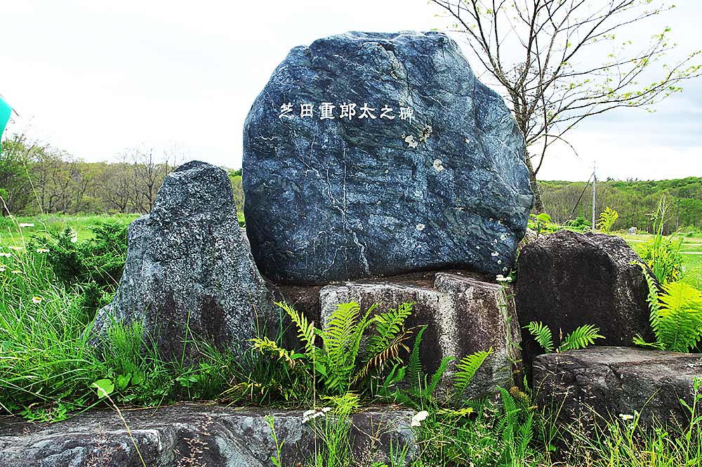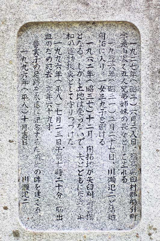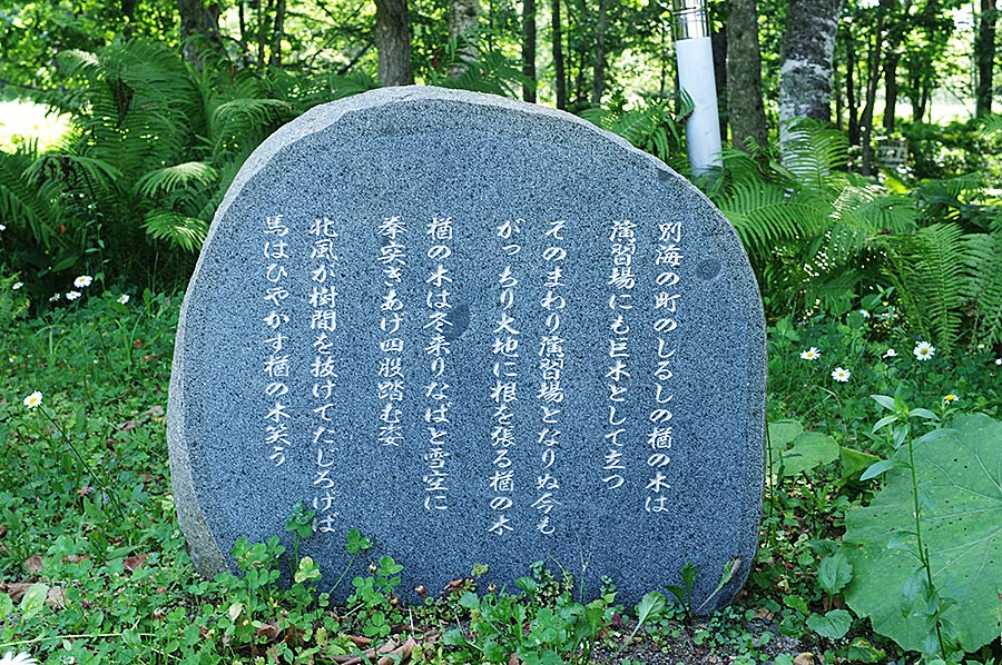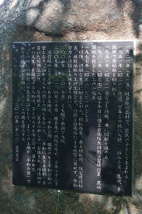 最初に碑文を紹介。表麺碑文「時速四キロの人生 矢臼別演習場の主 川瀬氾二」後面の碑文「別海の町のしるしの楢の木は演習場にも巨木として立つ そのまわりは演習鳩なりぬ今もがっちり大地に根を張る楢の木 楢の木は冬来たりなばと雪空に拳突きあげ四股踏む姿 北風が樹間を抜けてたじろげば馬はひやかす楢の木笑う」側面には石版を埋め込んであり川瀬氾二氏の略歴が記されている。「1962年 (大15) 岐阜県川島村で、農民の子として生まれる。1951年 (昭26) 渡道。翌年この地に入植。「拝み小屋」生活、手抜根で原始林を切り開く。1956年 (昭31) 普美子と結婚。共に開拓を進める。1962年 (昭37) 入植10年目に陸上自衛隊矢臼別演習場設置。農地買収を拒否した2戸が残る。1977年 (昭52) ただ1戸となる。以降、過酷な生活に耐えながら、移転強要、あと地取得、住宅建設妨害、遊牧地取り上げ工作など、行政と自衛隊による攻撃に屈せず、平和勢力と連携し土地を守り抜いた。2008年 (平20) 10月 くも膜下出血で入院2009年 (平21) 4月20日 療養先の病院で死亡。享年83才 演習場のど真ん中にある土地は、「平和公園」構想のもと平和運動の砦となり、訪れる人の癒やしともなった。「平和に生きる権利」を貫いた川瀬氾二は「反戦地主」「憲法の申し子」と称され「時速四キロの人生」提唱する人柄は、多くの人を呼び寄せ、慕われた。この地に川瀬氾二が生きた証として、またこの土地が「平和の砦」であり続ける事を願い、ここにこの碑を建立する。2010年 (平22) 5月吉日」※建立者名は刻まれていないが矢臼別平和委員会か?。矢臼別演習場は別海町など3町にまたがる日本最大の演習場でその中に川瀬牧場がある。国家権力には一歩もひかず、農地の売り渡しを拒否してたたかいつづけた川瀬氾二さんの生き方は、大地に根を下ろした農民の姿でもあった。同所には川瀬氾二さんと共に生きた妻・普美子さんの碑と道東別海町で平和運動に生涯をかけた芝田重郎太氏の碑があります。昭和40年より「平和盆踊り」が開催され、平成19年に「平和会館」ができ、平成31年には「矢臼別平和資料館」が完成している。