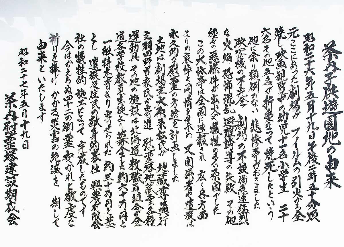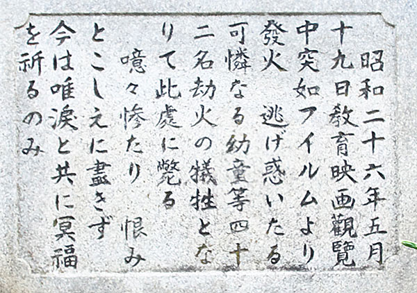 碑文より「昭和二十六年五月十九日教育映画觀覧中突如フイルムより發火 逃げ惑いたる可憐なる幼童など四十二名劫火の犠牲となりて此處に斃る 噫々惨めたり 恨みとこしえに盡きず 今は唯涙と共に冥福を祈るのみ」※上映中のフィルム引火から劇場全焼、映画鑑賞中の幼児11名、小学生26名、その他5名が折り重なるように焼死した大惨事事故で、慰霊のため各地より寄せられた寄進や募金を元に、遺族や地域住民の努力と奉仕によって翌年に慰霊塔と地蔵堂が建立された。地蔵堂横の由来説明板に「映写機の不完全 劇場の不設備 急速猛烈な火焰 恐怖混乱 避難誘導の失敗 その他種々の悪条件が出火や犠牲の多い原因でした」とあり。昭和18年に倶知の安劇場・布袋座で起こった火災の教訓が生かされていない。