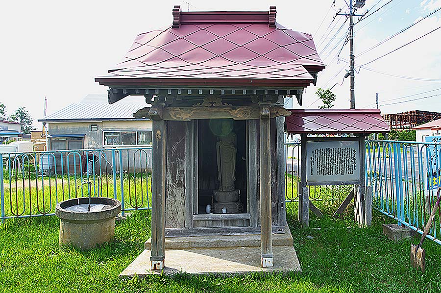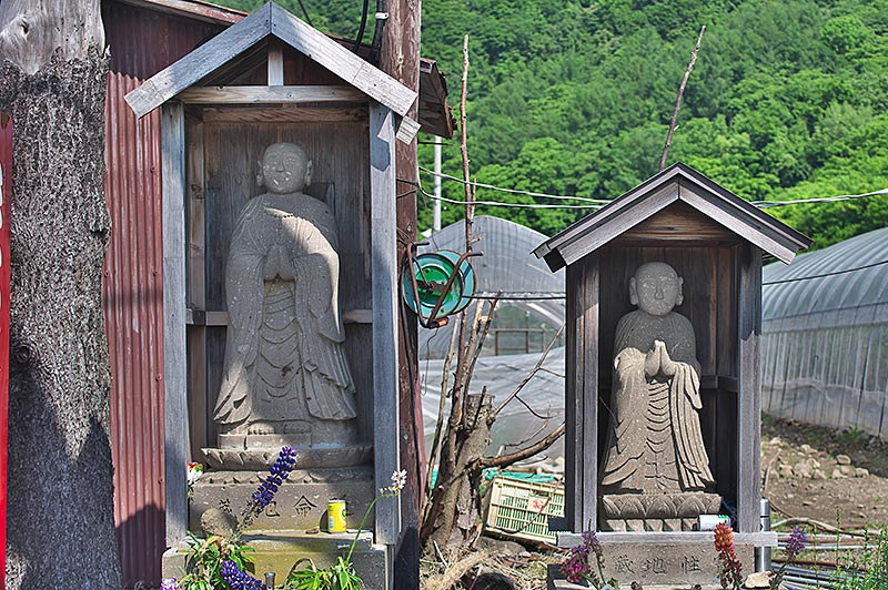 下砥山の砥山橋から200mほど北側の小祠内にある地蔵。旧簾舞発電所水路で水難した8人の慰霊のため、上砥山の土地の所有者であった上村家が昭和39(1964)年に建立した。2体のお地蔵尊があり、向かって左側の大きな地蔵尊が延命地蔵で台座に「延命地藏」と刻まれています。この地蔵尊は八剣山の反対側である東側の麓に建てられていたようですが、市道が国道のバイパスとして整備された時に現在地に移されたようです。