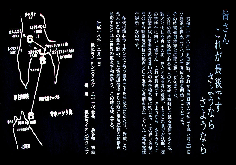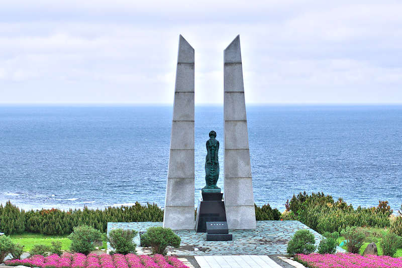 北海道稚内市の稚内公園内にある九人の乙女の碑は、1945年8月20日の樺太真岡へのソ連軍侵攻に際し真岡郵便局で連絡業務のため残留していた電話交換手の女性12人のうち、青酸カリなどを用い自決した9人の電話交換手の慰霊碑。碑は、高さ1.8m、幅2.4m、登別石で三つ折りの屏風風に造られ、右側に本郷新が制作した交換手姿の乙女の像銅版レリーフをはめ込み、中央に当時の北海道知事町村金五の筆で乙女達の別れの言葉、左側に9人の名前と碑文が刻まれている。戦後になって地元の樺太関係者と遺族の手によって氷雪の門と九人の乙女の碑が建立され、ともに1963年8月20日に除幕された。碑文には「慰霊碑の中央には「皆さん これが最後です さようなら さようなら」と刻まれている。猿払村の猿払電話中継所跡にも九人の乙女の碑と同じ「皆さん これが最後です さようなら さようなら」と書かれた碑があるが、樺太泊居郵便局の局長は『交換台にも弾丸が飛んできた。もうどうにもなりません。局長さん、みなさん…、さようなら。長くお世話になりました。おたっしゃで…。さようなら』だったと碑文とは異なる証言を残している。碑文では生存者については触れられていないが、「九人の乙女」に関する資料は開基百年記念塔内の北方記念館に展示されています。日本テレビ開局55年スペシャルドラマ『霧の火ー樺太・真岡郵便局に散った九人の乙女たち』は史実を基にしたフィクションで創作された部分も多いようだ。樺太のシーンは稚内市の夕来付近、郵便局は豊富町の兜沼旧郵便局などでロケが行われた。DVDが発売されているのでまだ手に入るかもしれない。◇建立年:昭和38年8月20日 ◇設置者:慰霊碑建立期成会 ◇所在地:稚内市稚内村ヤムワッカナイ ◇Gmap:Gマップ