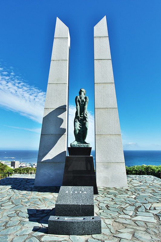 昭和38年2月稚内樺太引揚者連盟会長米倉八郎太を会長とする慰霊碑建立期成会を結成し、全国樺太連盟会長柳川久雄、同副会長下出繁雄、同北海道支部連合会長渡辺彦太郎らの協賛を得て、全国の樺太引揚者に呼びかけ建設運動を展開し、隣接する乙女の碑とともに樺太島民慰霊碑として昭和38年に地元の樺太関係者の手で樺太の島影を水平線上に望む稚内公園に建立された。碑文「人々はこの地から樺太に渡り、樺太からここに帰った。戦後はその門もかたく鎖された。それから18年、望郷の念止みがたく樺太で亡くなったおおくの同胞の霊を慰めるべく肉眼で樺太の見えるゆかりの地の丘に木原豊治郎氏、笠井安一氏の熱意と、全国樺太引揚連盟の賛同並びに全国からの心あたたまる協力によって、ここに記念碑を造る。氷と雪の中できびしく生き抜いた人々の象徴する女人像、望郷の門、霊石を3位一体とする彫刻家本郷新先生の力作がここに出来上がった。この記念碑を氷雪の門と命名した。」※碑の構造は、黒大理石の霊石を配した高さ8mの望郷の門を背に、きびしい風土に耐えて築いてきた郷土を、肉身を、財産を失い、絶望の中にひらすら祈りを捧げる女の姿をあらわす2.4mのブロンズ女人像が立つ。かつては日本領土だった樺太で亡くなった全ての日本人のための慰霊碑で、第二次世界大戦終戦後のソ連軍の侵攻による樺太内での戦争で亡くなった日本人だけを対象としているわけではない。当時を知る人は今では数少なくなってしまった。◇建立年:昭和38年8月20日 ◇設置者:慰霊碑建立期成会 ◇所在地:稚内市稚内村ヤムワッカナイ ◇Gmap:Gマップ