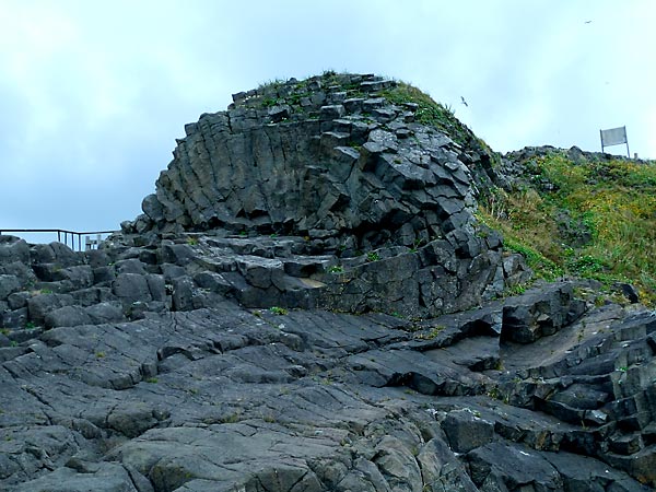 花咲港を一望する花咲灯台の下に、直径6mに及ぶ放射状節理の玄武岩で、形の見事さと大きさが珍しい国の天然記念物「根室車石」があります。車石とは車輪状構造の石をいい、通称ホイールストーンという。海底に堆積した土砂の中に流入した溶岩は枕状溶岩を形成し、急速に冷やされて中心へ向かう割れ目を作ります。これを輪切りにすると車石になります。花咲岬の根室車石を見た方なら判ると思いますが、完全な円形では無く放射状節理の発達したもの。本物の車石は海側に出て大きな石の左側を見てください。きれいにはめこまれた車状の石を見る事ができる。小さな車石は根室半島のいたる所にあるそうです。半島部を歩かれる時には注意して見てください。