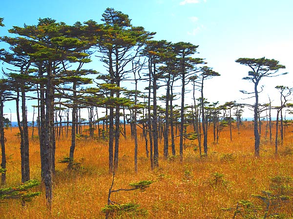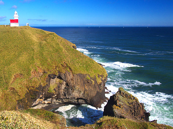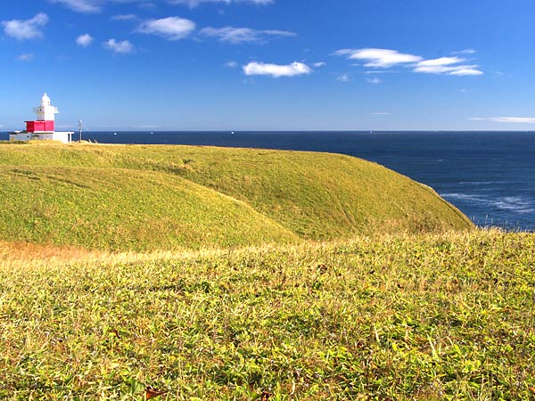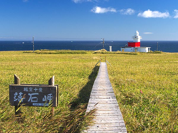 根室市街から南西に向かって約21km、太平洋に突出した岬の入り口から左側に落石港を見ながら坂道を登ると草原を貫く一筋の道が真直ぐにのびてゲートで車は此所で行き止まり。なおも続く直線の道を徒歩で進んでいくと落石無線局跡がある所につきます。その先に以前アトリエだったという廃屋の有る所で落石灯台に向かう道と、右折して落石岬の突端に向かうダートとに二手に分かれる(岬ルートは途中で道が消える)。直進し赤エゾマツ林から高床式の丸太を横に並べた木道になり靴底が薄いと足を痛めやすい、濡れていると滑るので歩きにくいが、元々が灯台の作業道で観光用ではないので致し方ない。木道に入るとまもなく国の天然記念物に指定され、国内でここだけにしか自生していない「サカイツツジ」が見られる(見頃6月上旬)。全体がテーブル状の台地になっていて林を抜けた台地の中央は林に囲まれた湿原となり不思議な感じのする空間。木道はこの不思議な空間からもう一度林に入り、そこを抜けると目の前に太平洋が広がり、光度200万カンデラで35km先まで光る落石灯台が見えてきます。灯台付近は岬感は余りありませんが、灯台と断崖の景色はなかなかのもの。