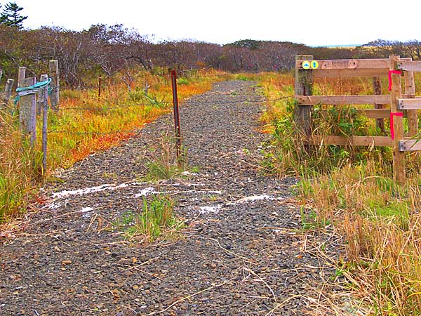 分岐点までは灯台行きのルートと同じですが分岐から先はラフロードで途中で道は消え現実的には困難で落石灯台経由でなければ行けそうにない。海岸線の断崖上には踏み跡が続いておりこれをたどると岬の先端部分には何とか行けると思いますが進むほど踏み跡は不明瞭になる。