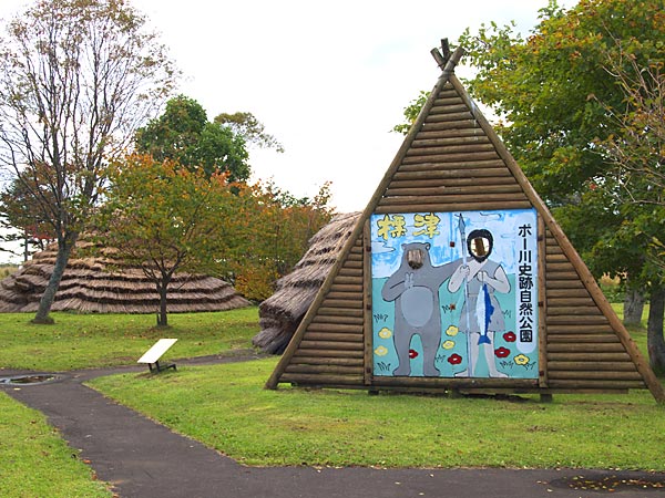ポー川史跡自然公園は歴史民俗資料館と伊茶仁カリカリウス遺跡、天然記念物標津湿原とからなる広い自然公園。ボー川は標津湿原を流れる伊茶仁川の小さな支流です。ポー川史跡自然公園内に入るとすぐ左手に標津町歴史民俗資料館があり隣は開拓時代の農家、学校、番屋などが立ち並んでいる開拓村が有ります。園内には復元された古代の住居も有り見学が可能。復元された学校の横が湿原への入口で木道を700m程進む、カリカリウス遺跡迄なら往復で1時間以上は見た方が良いでしょう。遺跡は原始の面影を残す森林に囲まれ、此処にも復元された住居がある。ヒグマが出没すると遺跡部分立ち入り制限となるが、湿原までなら問題は無い。
