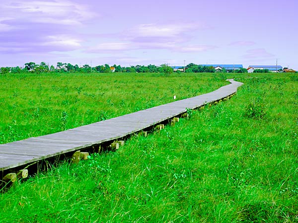 標津湿原には標津川流城の湿原と、標津川とに挟まれる形で全面積およそ2760へクタールに達する湿原があるが一般には上部の川北湿原と、下流の三本木湿原とに区分して呼ばれる。上部の川北湿原はヨシ類が優勢な感じですが下流部にあたるポー川流域の三本木湿原は、海岸線に平行して延びる砂丘列の背後にあり、標高は3m以内と標高が低く、面積もそれほど広くはない。三本木湿原で良く見かけるのはチャミズゴケとツルコケモモ、ヒメツルコケモモ、ガンコウラン、イソツツジ、ミツバオウレンなど。中間湿原にはワタスゲ、ヤチヤナギ、エゾカンゾウ、ホロムイスゲ、ヌマガヤなど湿原の体表的な植生が見られるが徐々に笹類の進出してきている。三本木湿原はポー川史跡自然公園の一部として保護と管理が行われ木道を完備する。